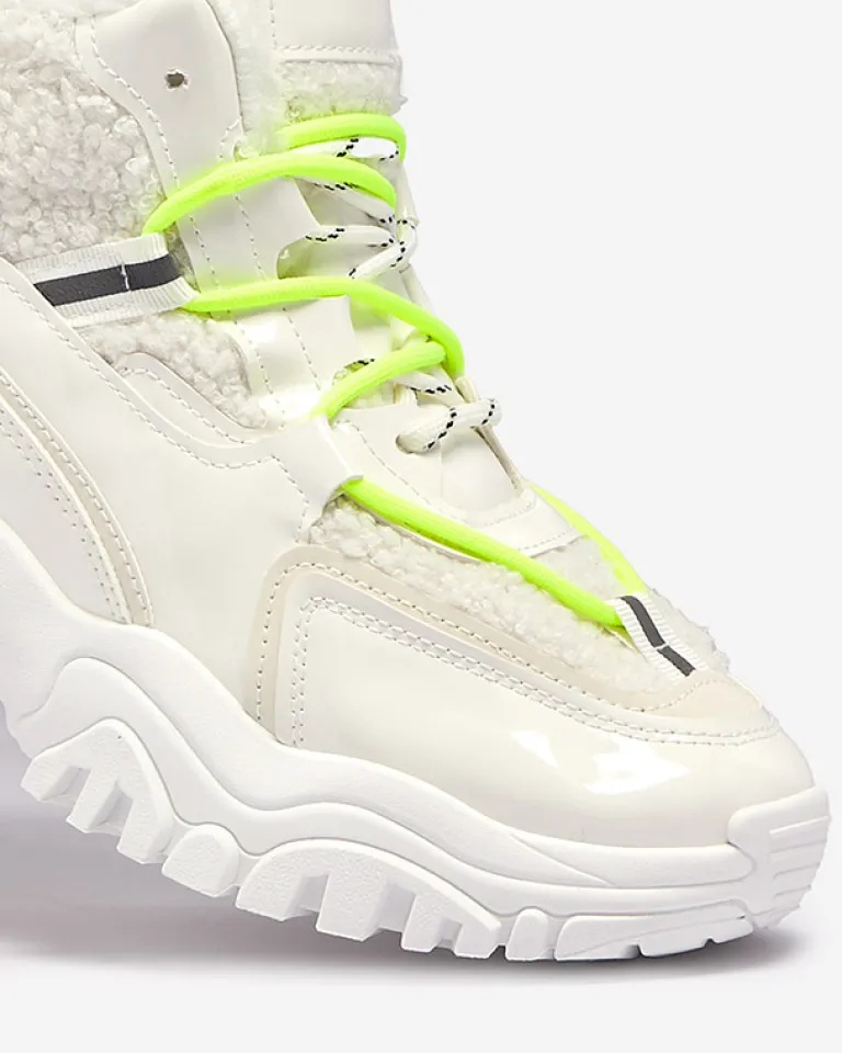 - Sportowe sneakersy damskie na grubej podeszwie, cholewka jest sznurowana i wykonana z połączenia lakierowanej eko skóry oraz tkaniny a’la futerko. Wnętrze w całości ocieplone sztucznym futerkiem. BIAŁE SPORTOWE BUTY ZIMOWE DAMSKIE ŚNIEGOWCE SAGGLO