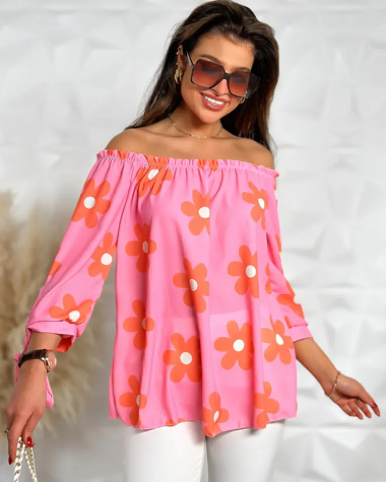 - Wyjątkowa bluzka damska a’la hiszpanka w kwiaty wykonana z miękkiego, przyjemnego materiału. Posiada okrągły dekolt z gumką oraz rękawy 3/4. Idealna na co dzień jak i specjalne okazje!