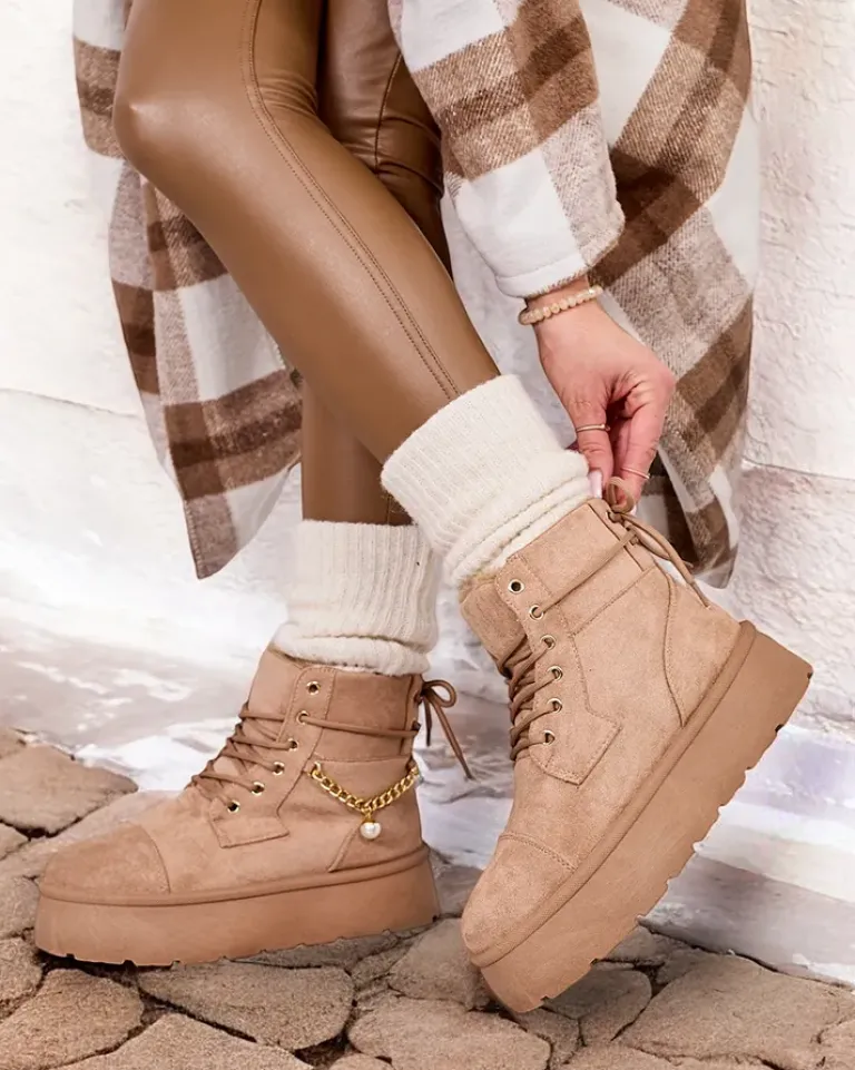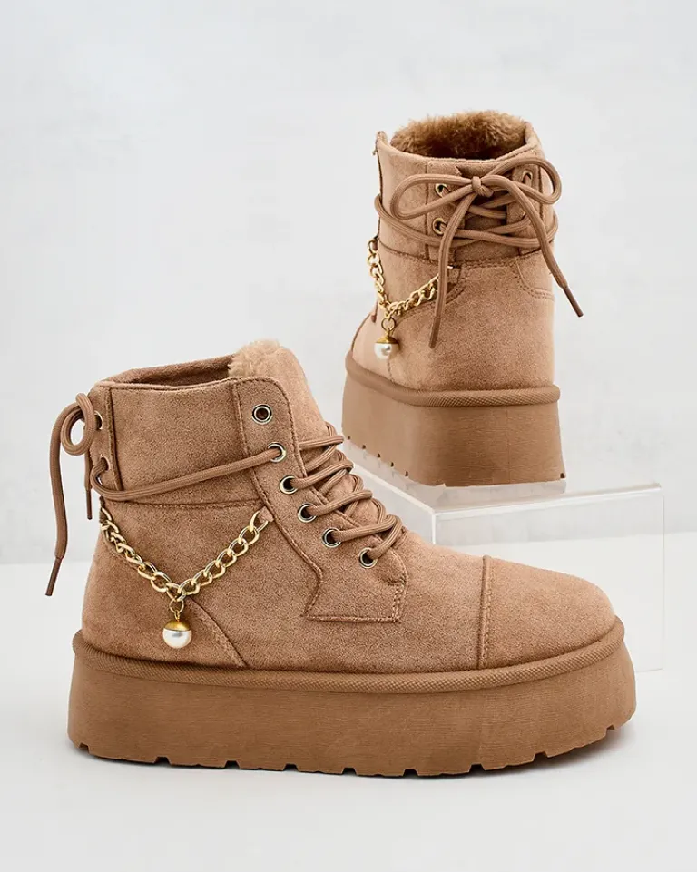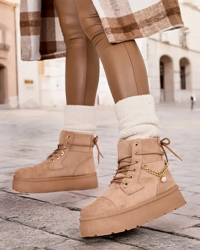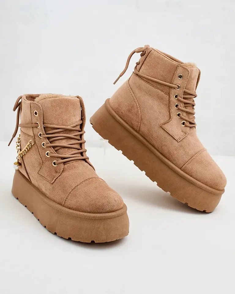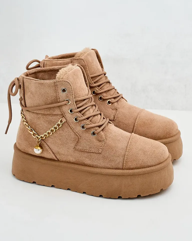 - Stylowe botki typu workery wykonane z eko skóry zamszowej. Buty są sznurowane. Model posiada platformę oraz futerkowe wypełnienie. Idealne na jesień!