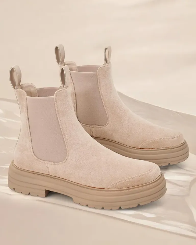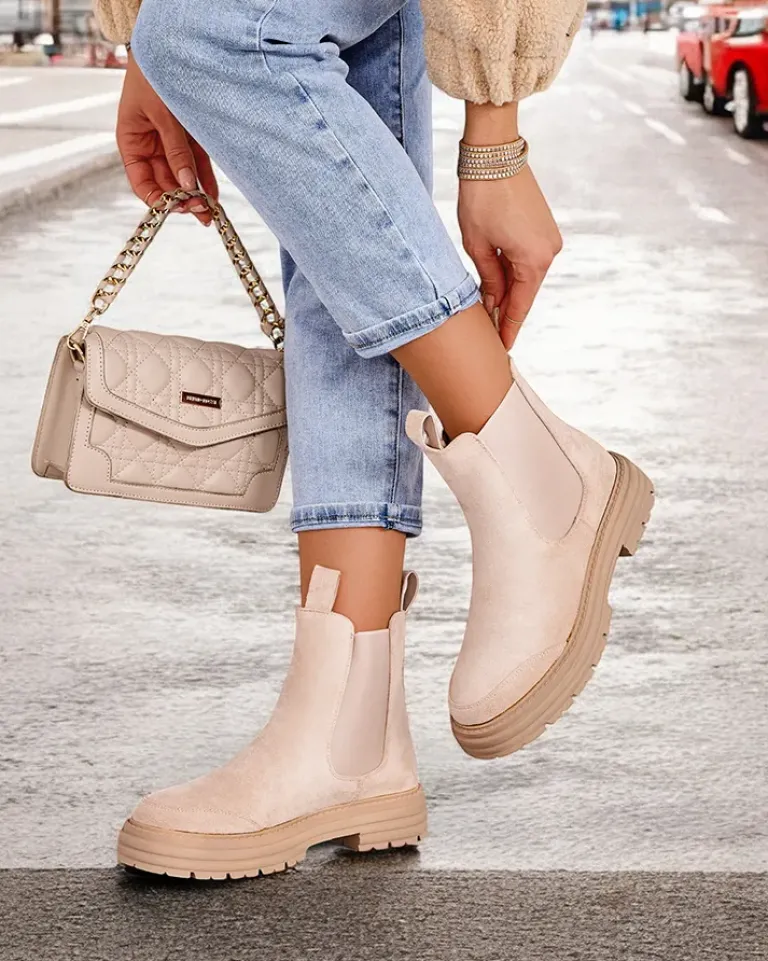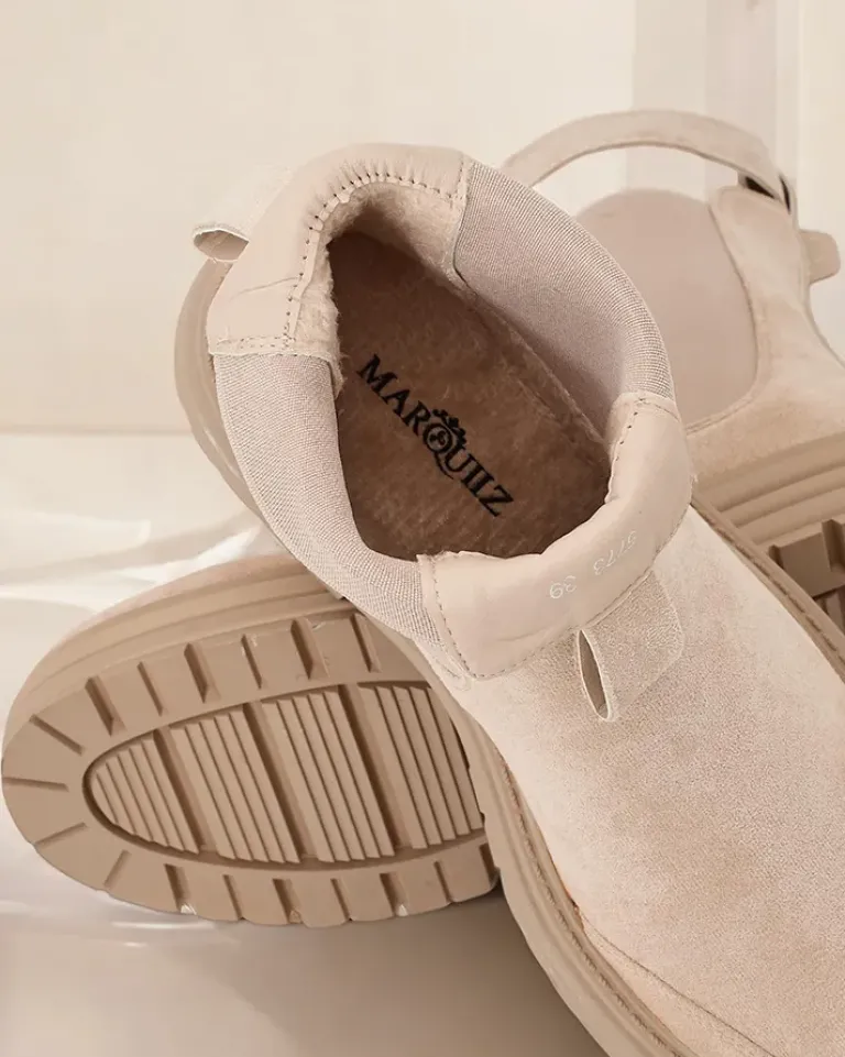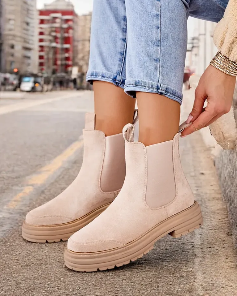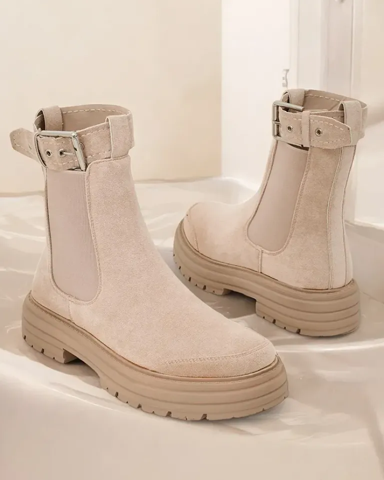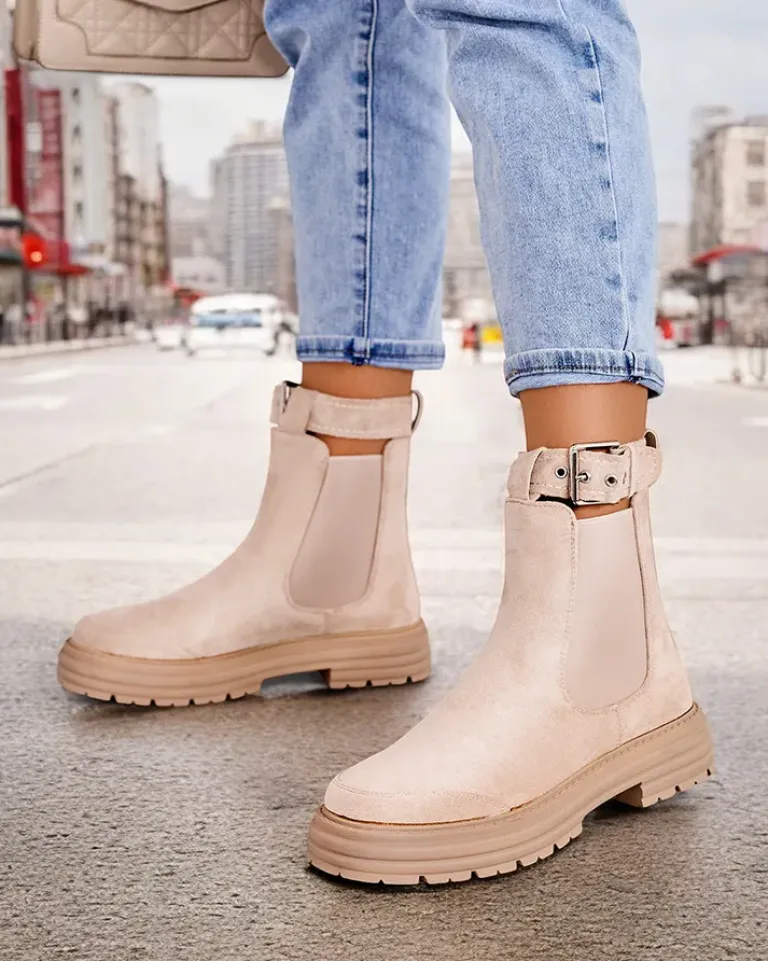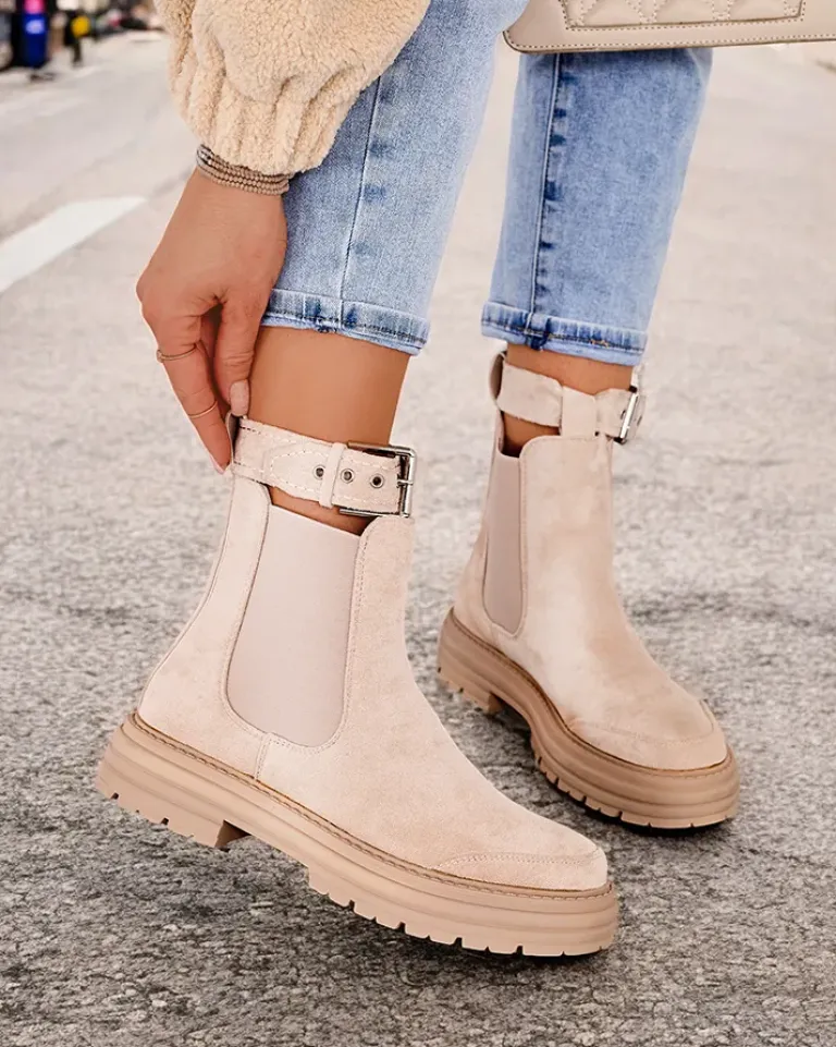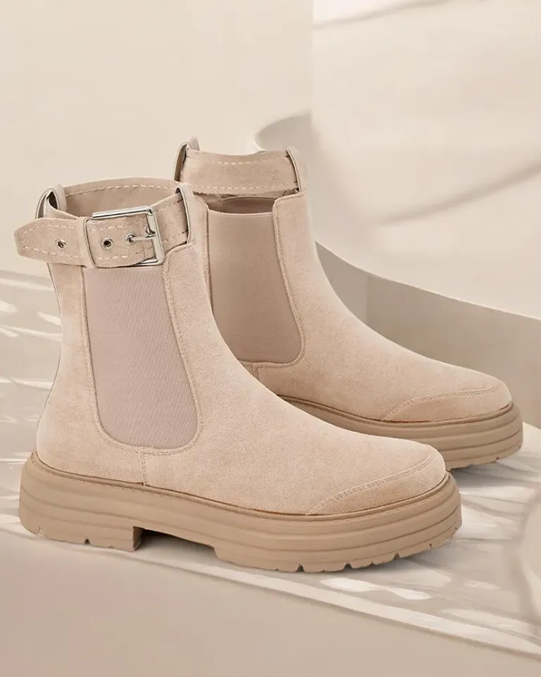 - Botki damskie na grubszej podeszwie. Obuwie wykonane z zamszowej eko skóry, które doskonale dopasowuje się do kształtu nogi. Model wsuwany, posiada delikatne ocieplenie. Zdobiony elastycznymi wstawkami i odpinanym paseczkiem wokół kostki.