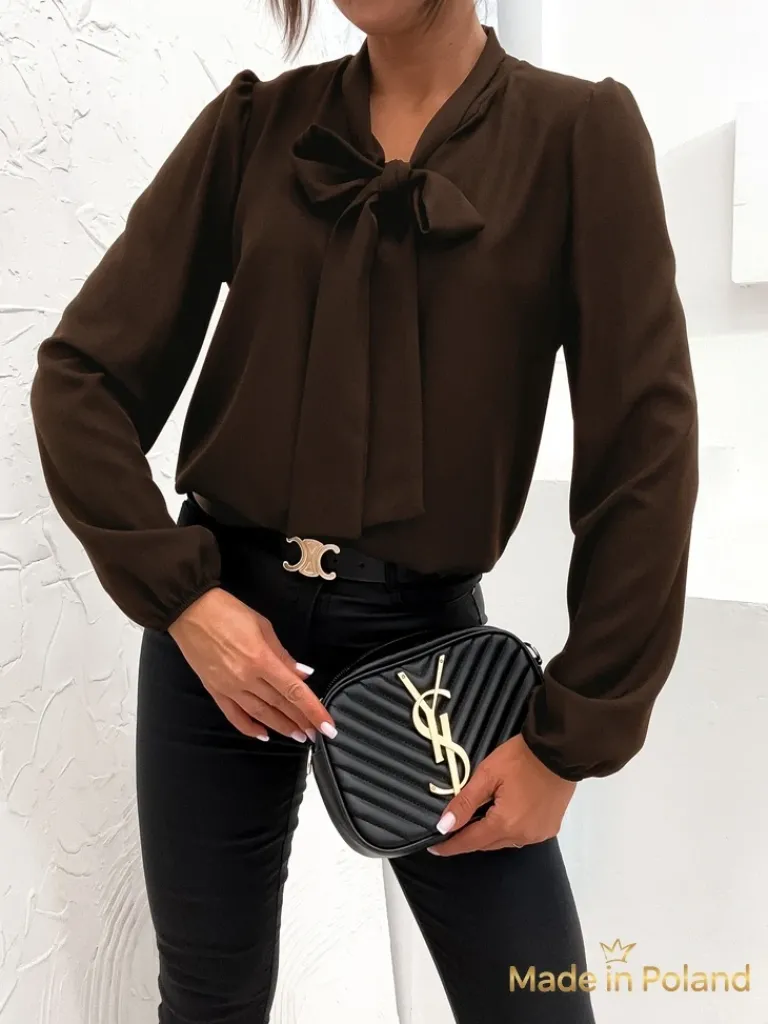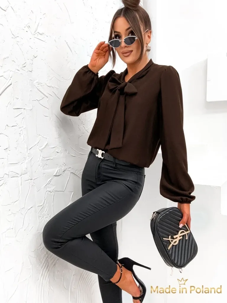 - Elegancka bluzka z subtelnie wiązaną kokardą przy dekolcie podkreśla kobiecą delikatność. Miękki materiał otula sylwetkę, a kokarda dodaje wyrafinowanego akcentu. Idealna na wieczorne wyjścia i specjalne okazje!