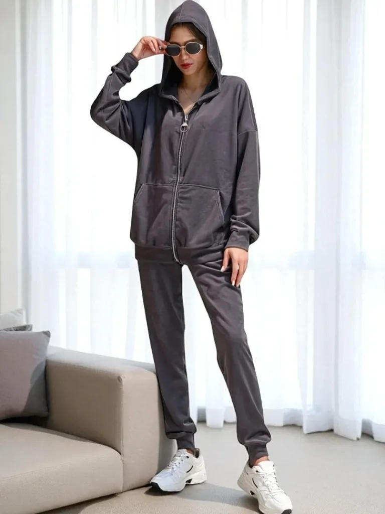- Damski komplet a’la welurowy wykonany z przyjemnego materiału. Bluza rozpinana z kapturem. Długie spodnie z gumą w pasie, 2 kieszeniami. Poczuj styl w tym wspaniałym komplecie!