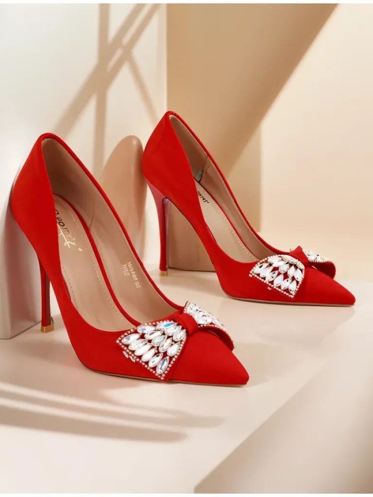 - Eleganckie damskie czółenka na szpilce, wykonane z eko zamszu, zdobione kokardką z cyrkoniami po środku. Środek buta jest wyłożony skórą ekologiczną, a nosek w szpic optycznie wyszczupli nogi.