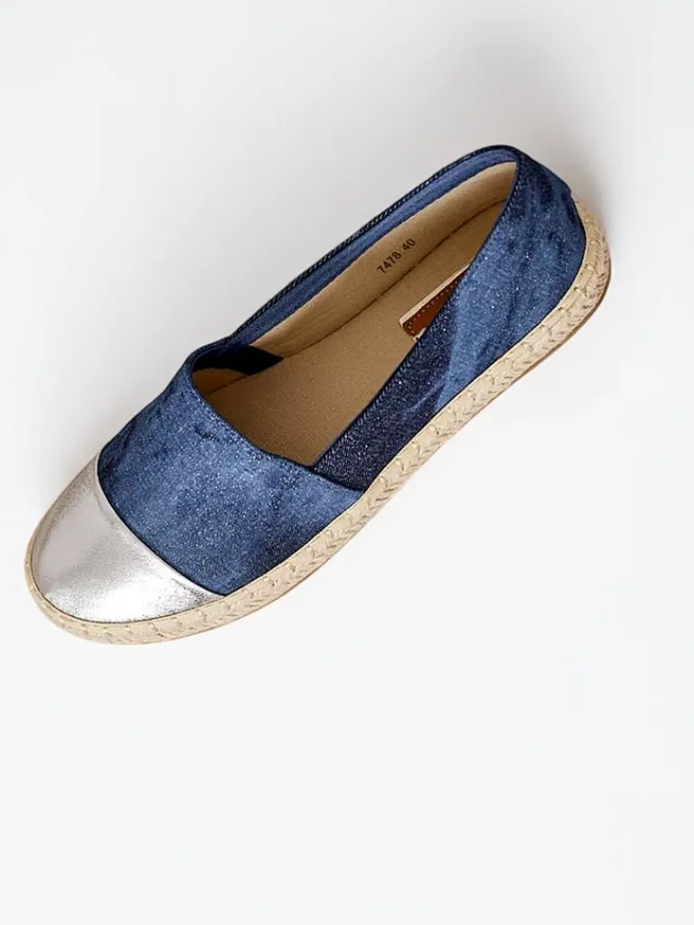 - Wyjątkowe damskie espadryle wykonane z tkaniny a’la jeans. Płaska podeszwa zdobiona sznurkiem jutowym zapewnia wygodę. Model wsuwany. Doskonały dodatek do letnich stylówek!