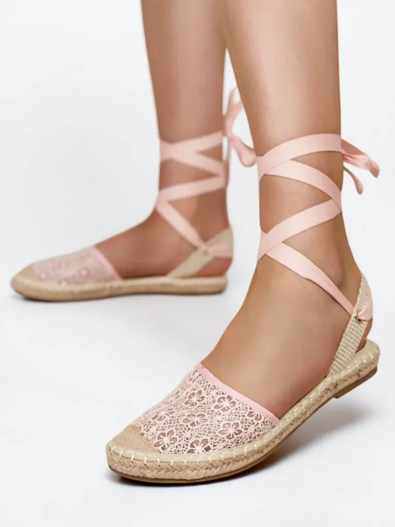 - Lekkie damskie espadryle wykonane z tkaniny a’la siateczka. Podeszwa zdobiona sznurkiem jutowym, a miękka wkładka pokryta jest materiałem tkaninowym. Posiadają okrągły nosek i ozdobne wiązanie. Idealne na lato!