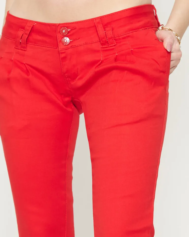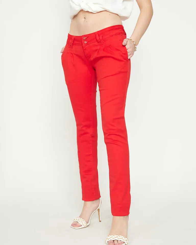 - Stylowe damskie spodnie typu rurki z niskim stanem, wykonane z tkaniny bawełnianej. Model zapinany suwakiem oraz guzikami, a z przodu posiada wsuwane kieszonki. Must have w szafie każdej kobiety! Dokładność pomiaru (+/-) 1 cm.