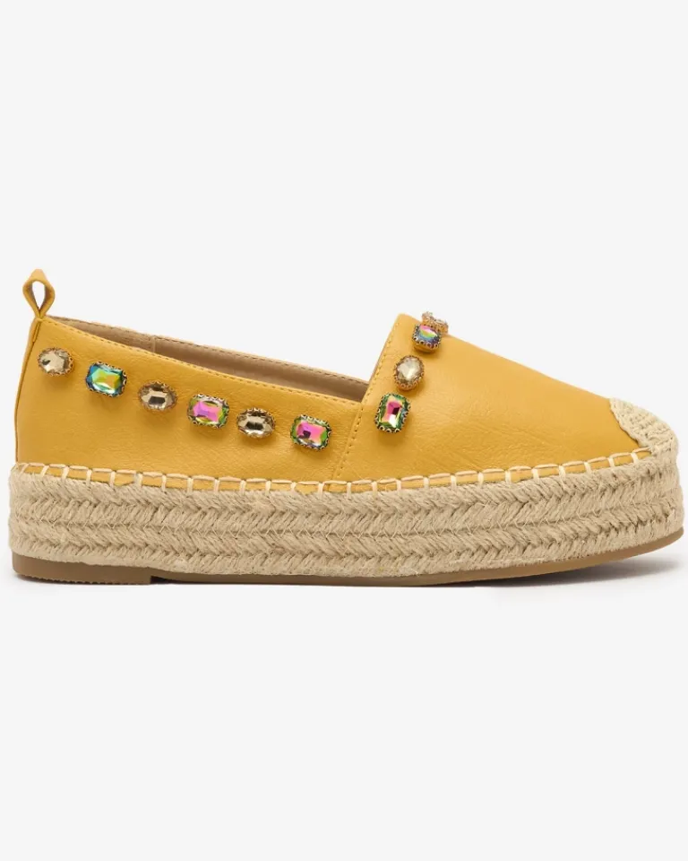 - Wyjątkowe espadryle damskie wykonane ze skóry ekologicznej, wkładka tkaninowa. Cholewka zdobiona kolorowymi kryształkami. Podeszwa pokryta plecionym sznurkiem jutowym. Idealne do tworzenia letnich outfitów!