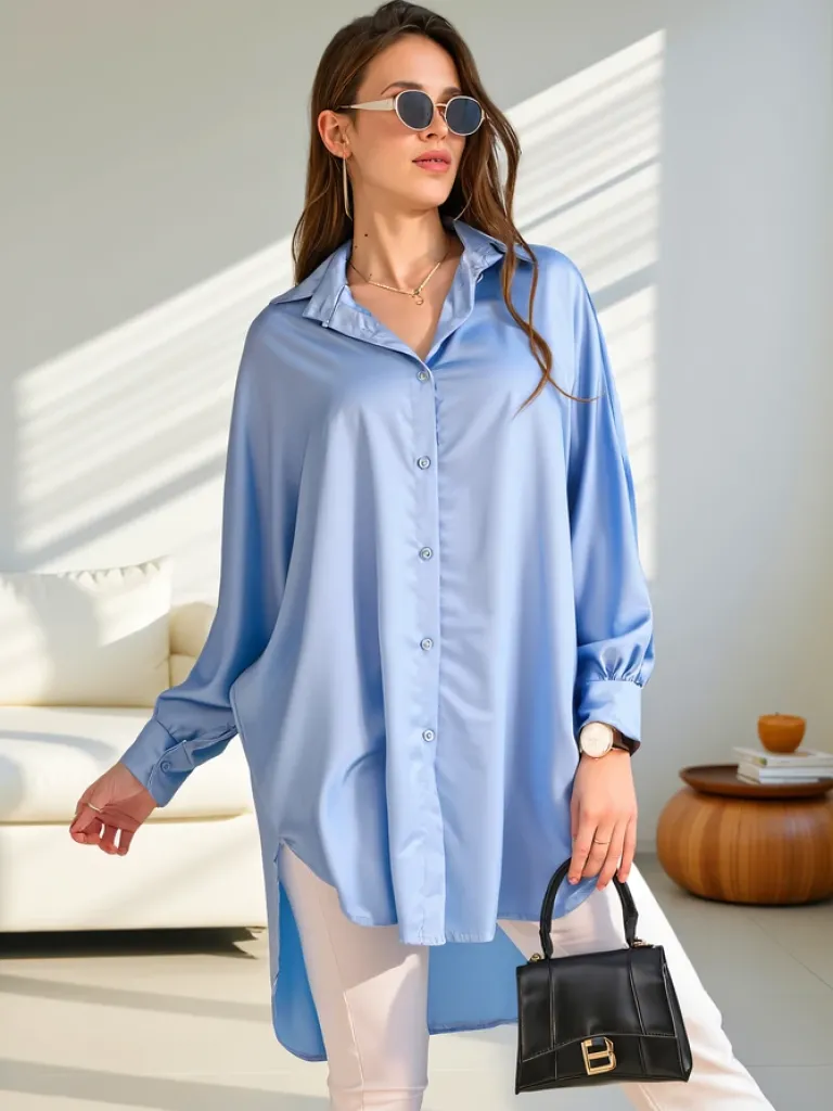 - Klasyczna, długa damska koszula oversize, wykonana z przyjemnej tkaniny. Posiada dekolt w serek oraz długie rękawy. Prosty krój zapewni dopasowanie do każdej sylwetki! UWAGA: Dokładność pomiaru (+/-) 1 cm.