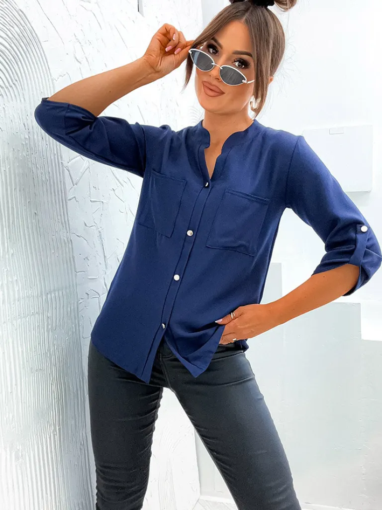 - Klasyczna damska bluzka a’la koszula z długimi, podwijanymi rękawami. Model z kołnierzykiem, jest zapinany na guziki. Must have w szafie każdej kobiety!