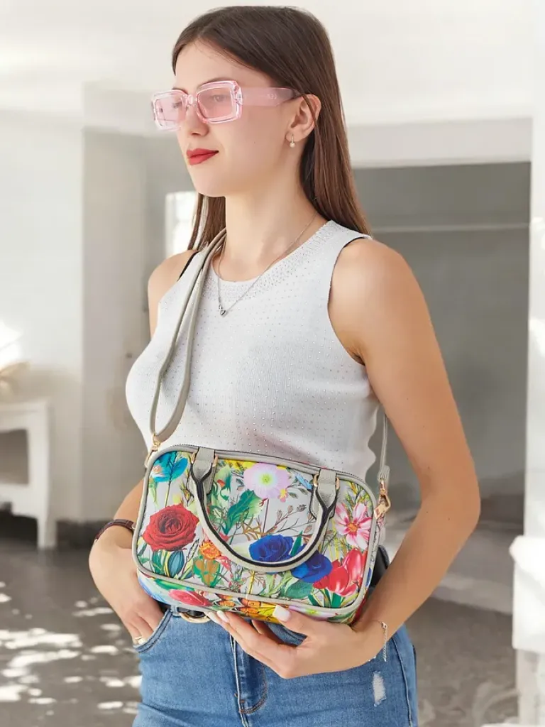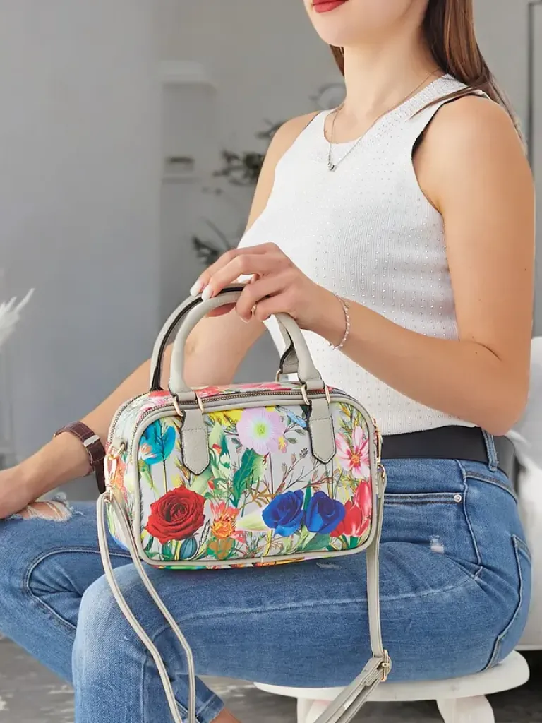 - Torebka damska typu kuferek z printem, zapinana na zamek, wykonana ze skóry ekologicznej.