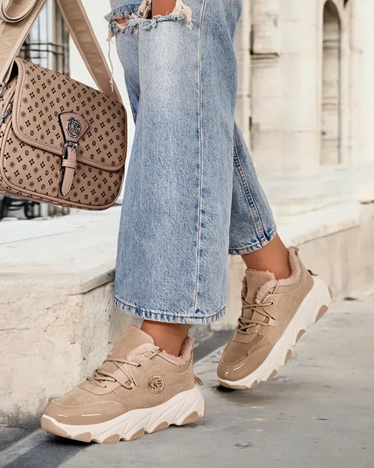 - Damskie ocieplane buty sportowe typu sneakersy na grubszej podeszwie. Sznurowana cholewka wykonana ze skóry ekologicznej zamszowej. W środku miękkie futerko. Super dodatek do Twoich zimowych outfitów w stylu casual!