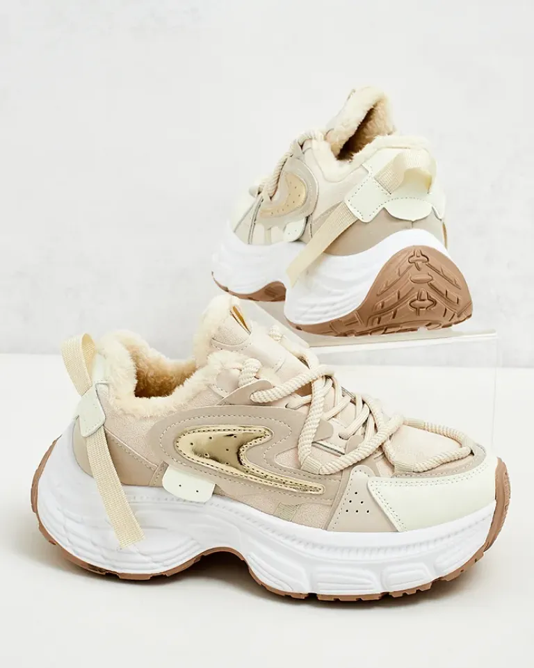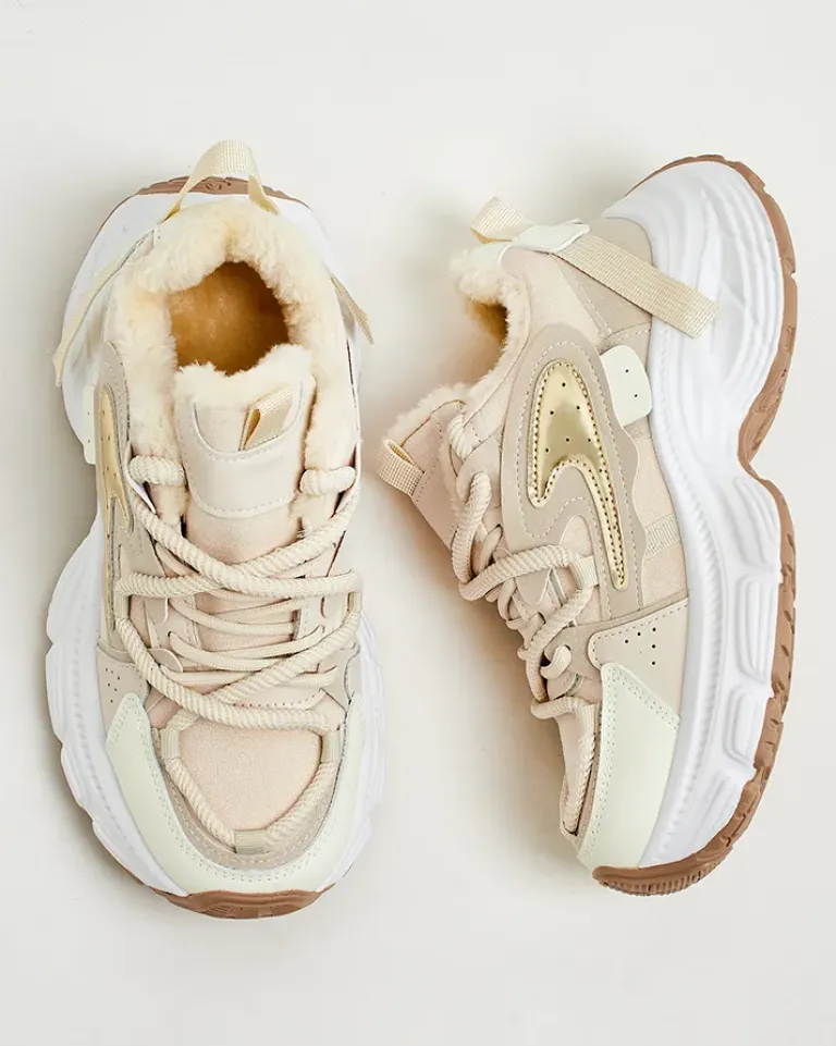 - Damskie ocieplane buty sportowe typu sneakersy na grubszej podeszwie. Sznurowana cholewka wykonana z zamszowej skóry ekologicznej z elementami eko skóry. W środku miękkie futerko. Super dodatek do Twoich zimowych outfitów w stylu casual!