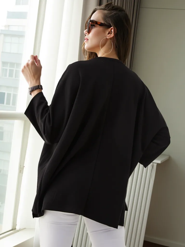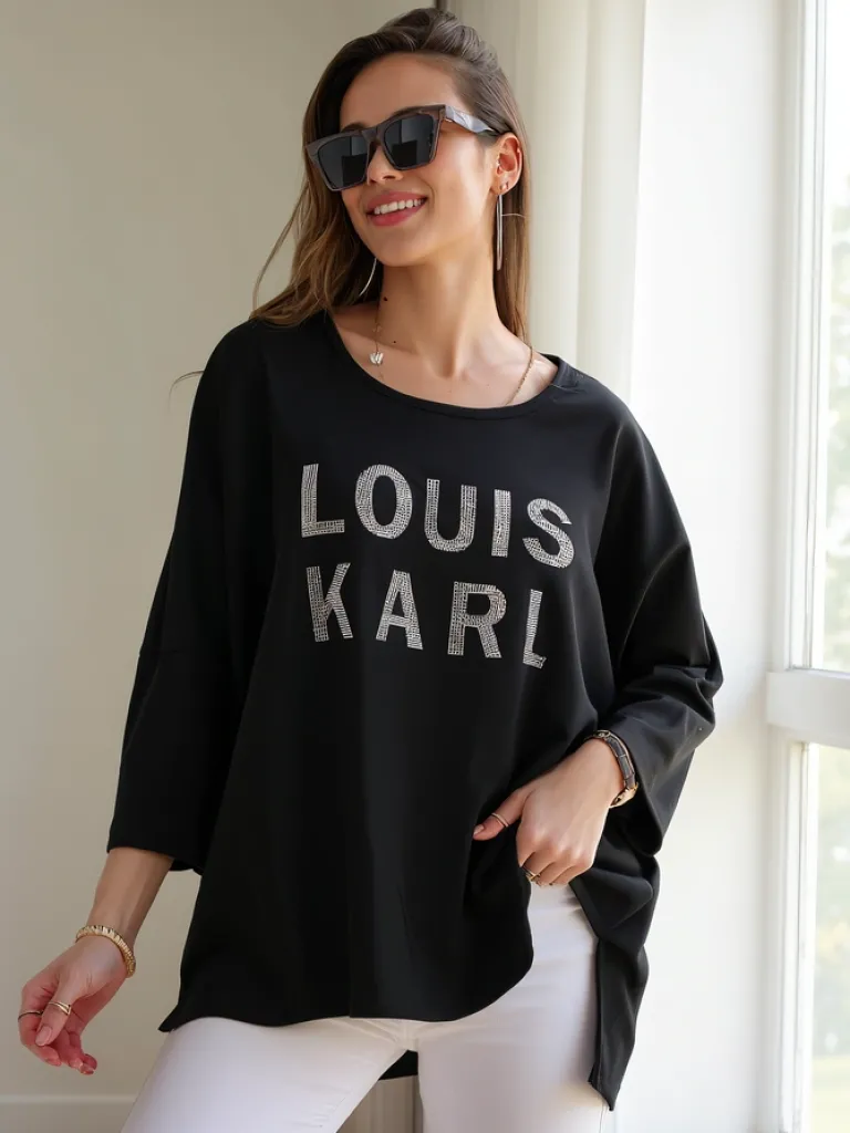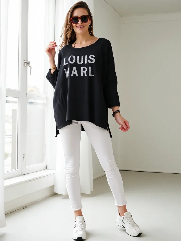 - Oryginalna damska bluzka z okrągłym dekoltem, uszyta z miękkiej i przyjemnej w dotyku tkaniny. Całość zdobiona subtelnym napisem z cyrkonii, a długi rękaw dodaje lekkości. Doskonały wybór do tworzenia modnych i stylowych zestawów!