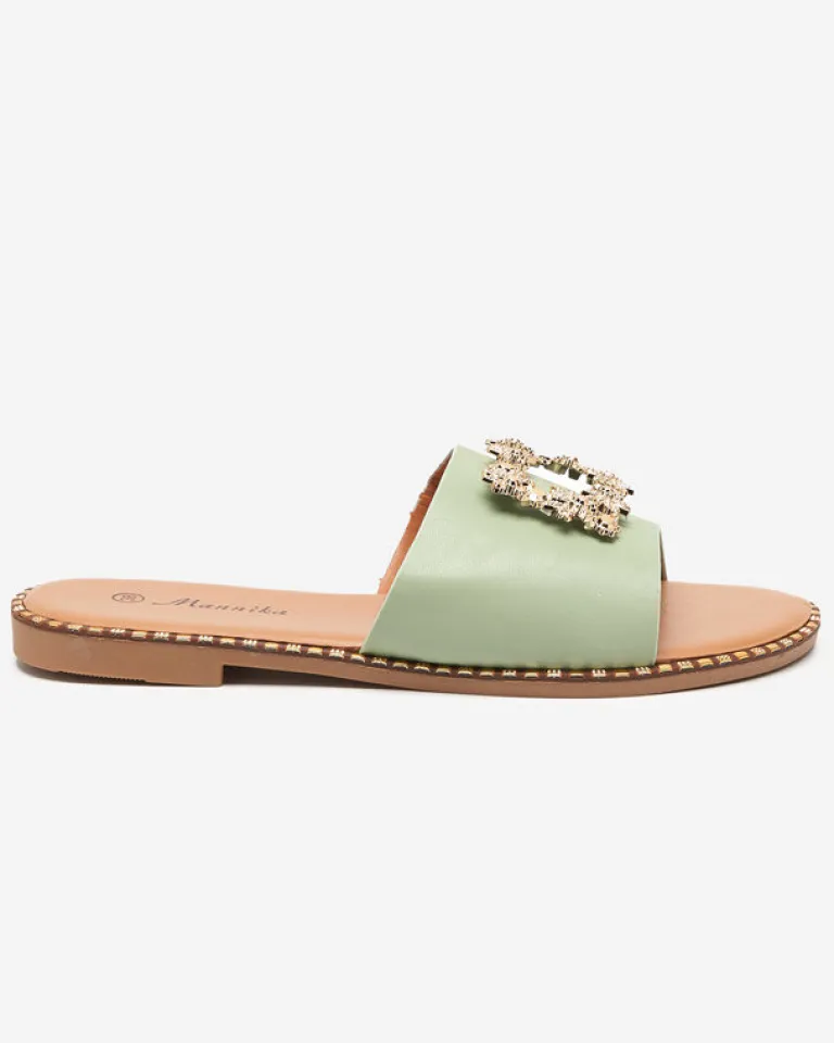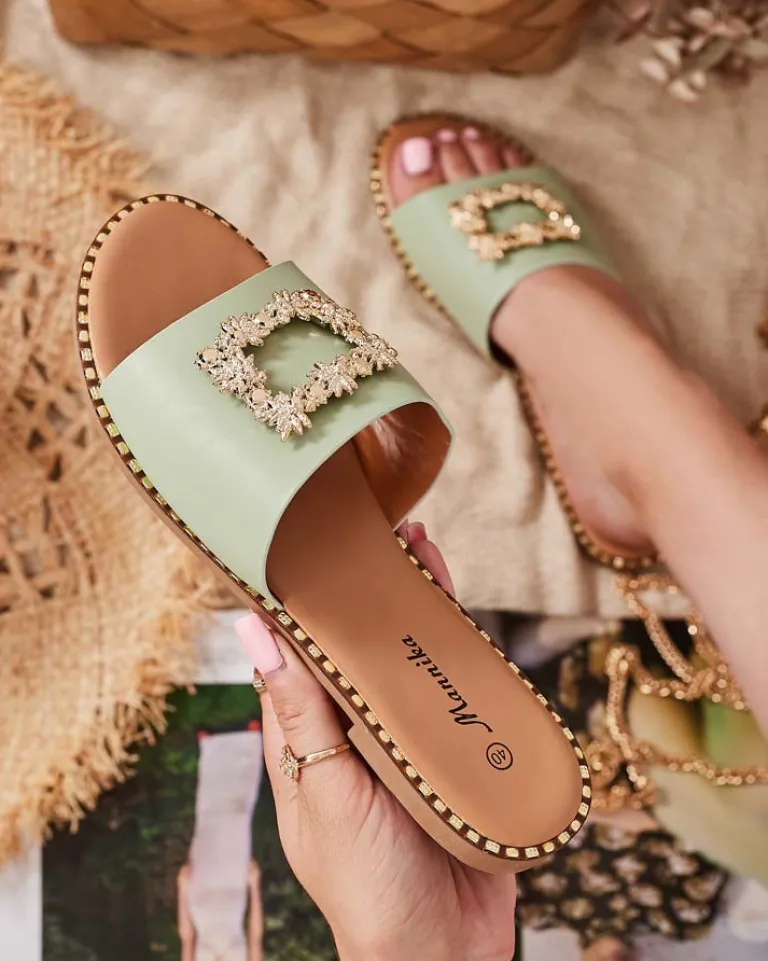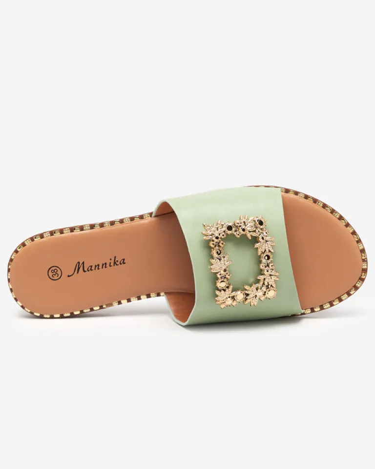- Wygodne damskie klapki ze złotą ozdobą, wykonane ze skóry ekologicznej. Podeszwa jest gumowa. Idealne do wakacyjnych stylizacji!