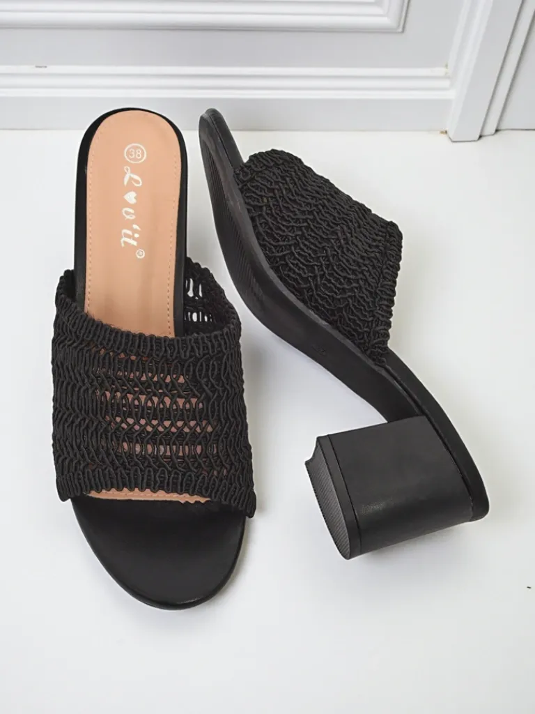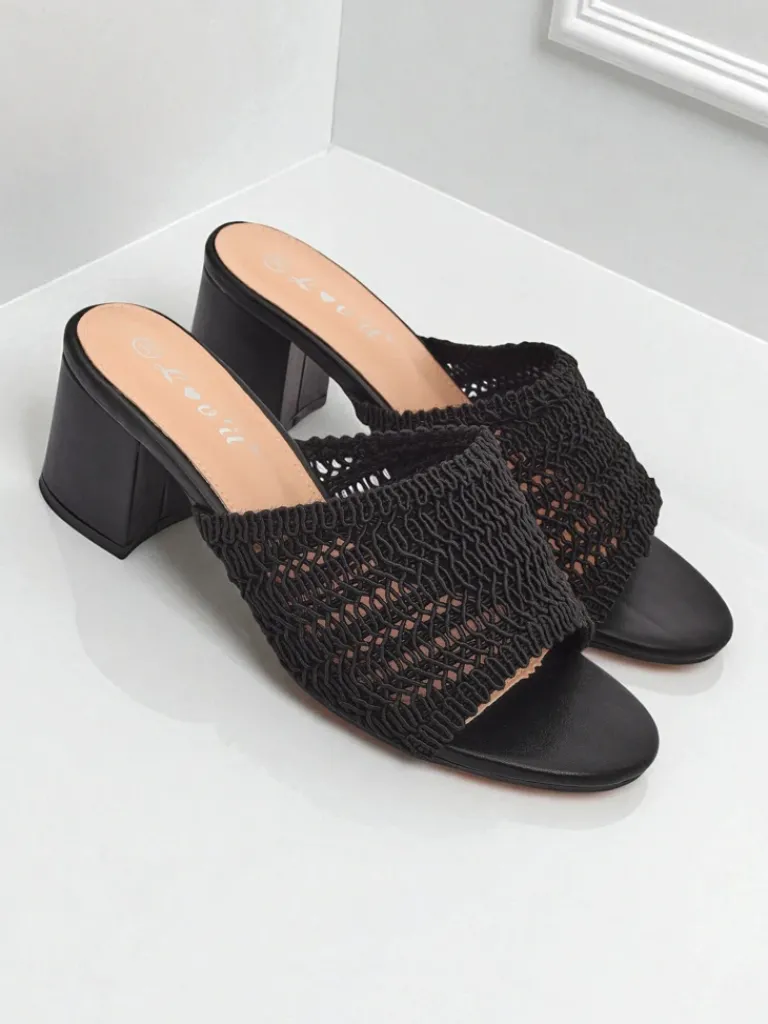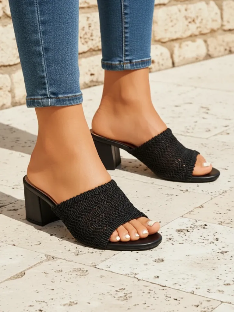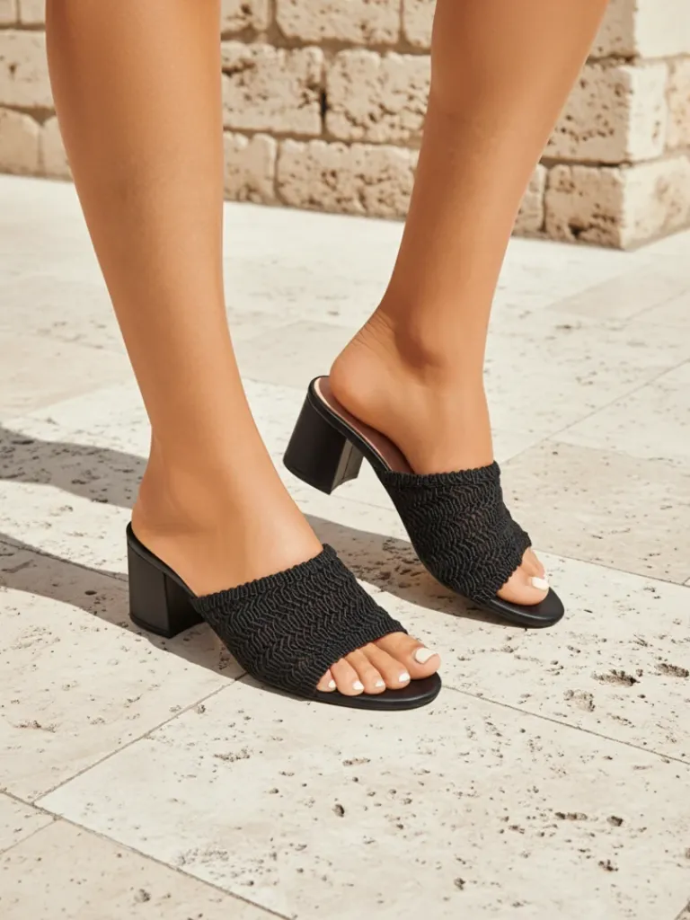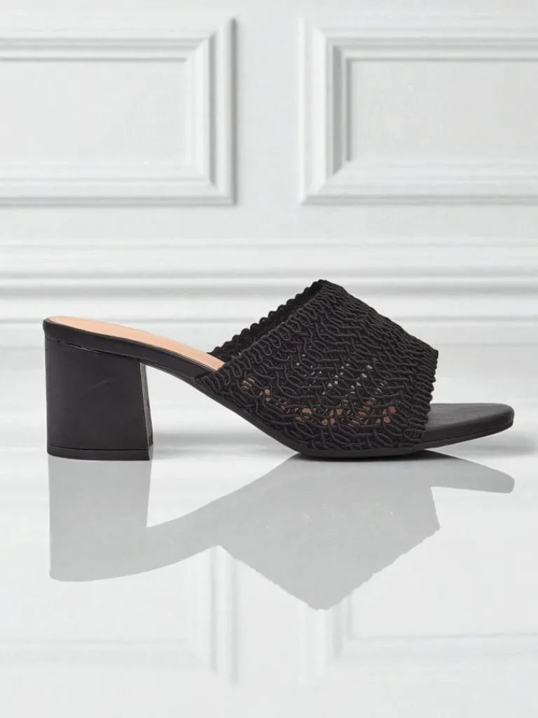- Klapki damskie na obcasie typu słupek z wkładką wykonaną ze skóry ekologicznej i paskiem z tkaniny plecionej. Stylowy fason i wygoda – idealne do letnich sukienek i eleganckich stylizacji na co dzień.