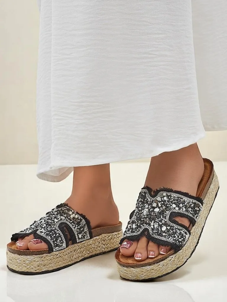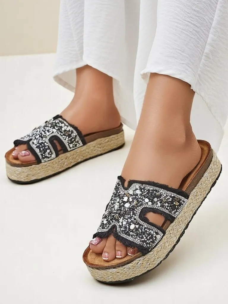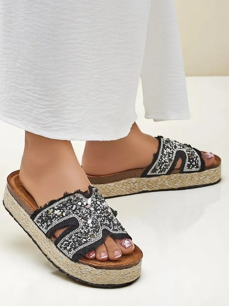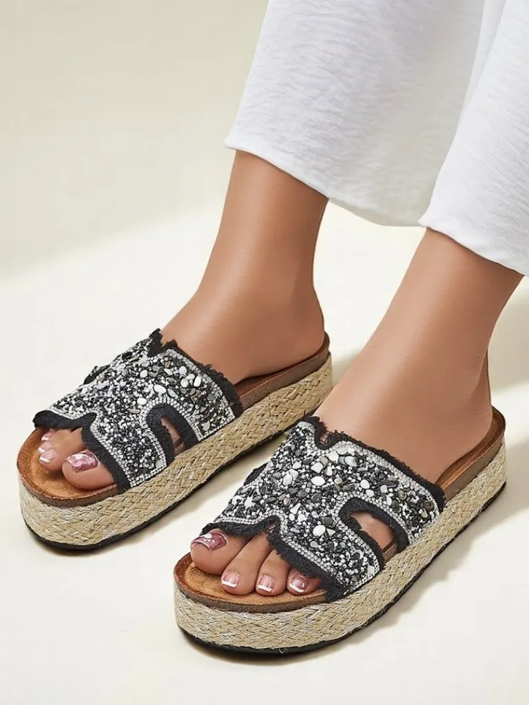 - Klapki damskie z nadmorskimi ozdobami wykonane z tkaniny, eko zamszowej wkładki i grubszej podeszwy – styl i komfort na lato.