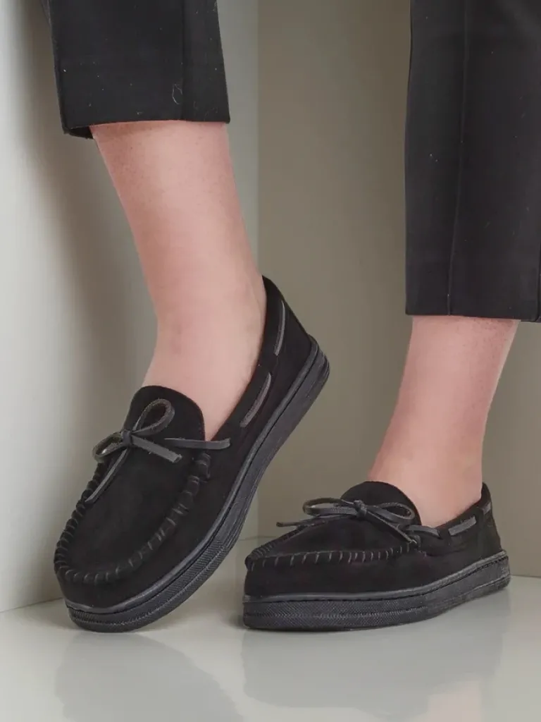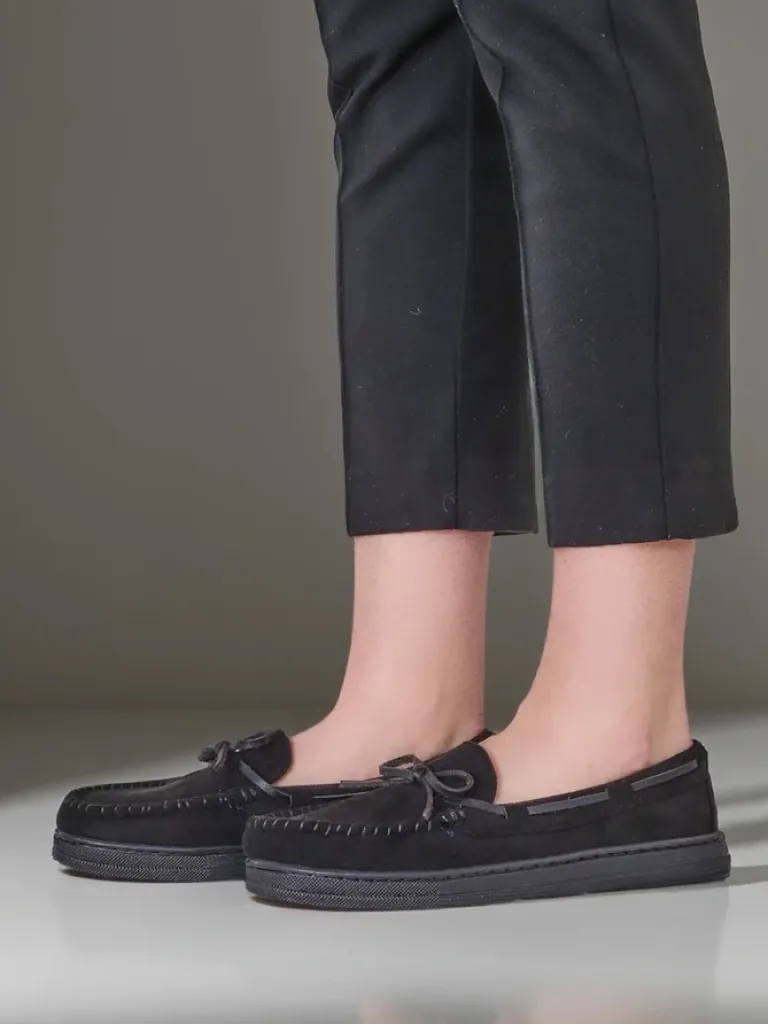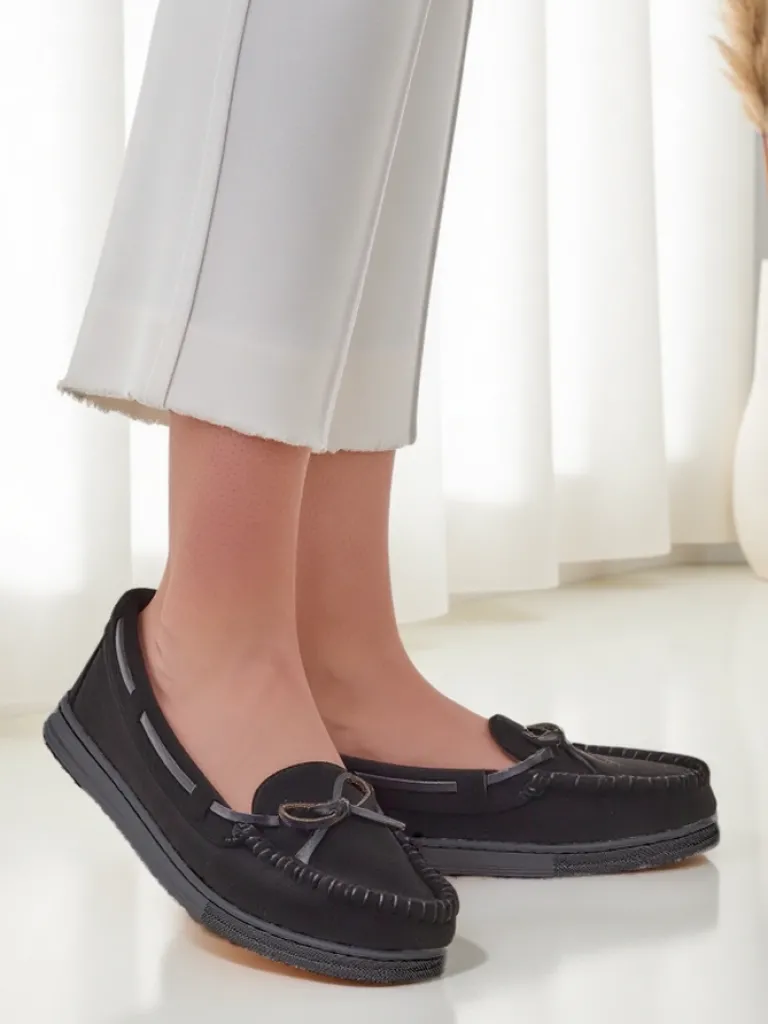 - Modne damskie mokasyny na płaskiej podeszwie. Para jest wykonana ze skóry ekologicznej zamszowej. Środek wyłożony miękką tkaniną. Nosek zdobiony kokardką. Idealne do casualowych outfitów!