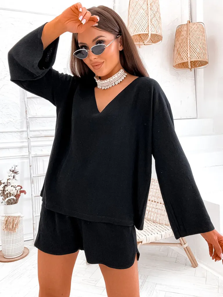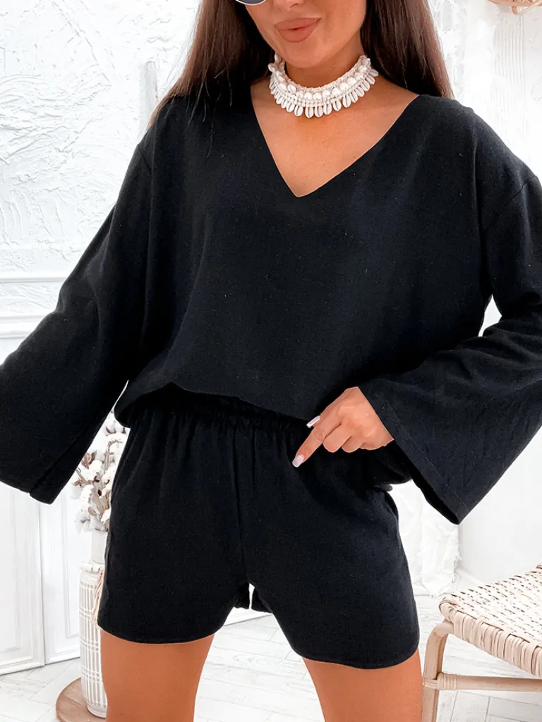 - Damski komplet wykonany z przyjemnego, lnianego materiału. Bluzka z długimi rękawami oraz krótkimi spodenkami z gumą w pasie i 2 kieszeniami. Poczuj lato w tym wspaniałym komplecie!