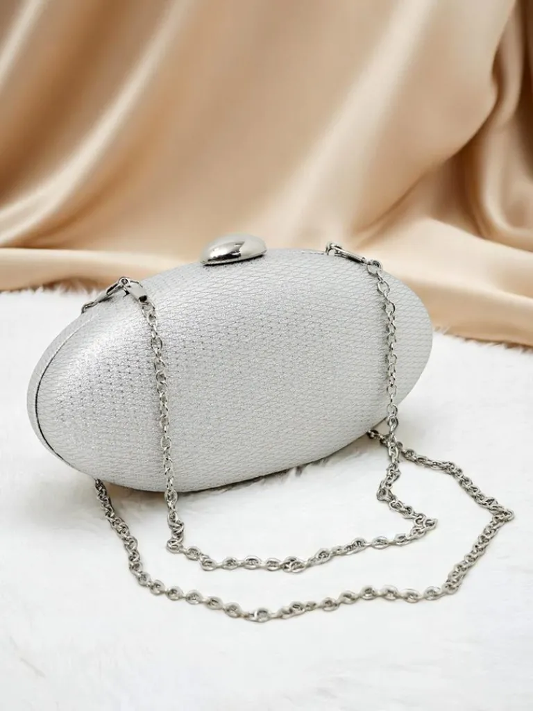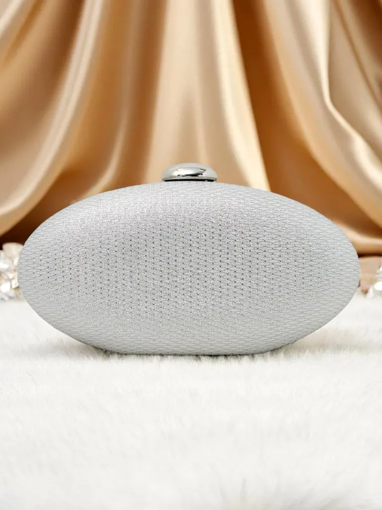 - Kopertowa torebka w kształcie elipsy z eko skóry, pokryta tkaniną z połyskującą nicią i tłoczeniem. Zapinana na zatrzask, z odpinanym łańcuszkiem – szyk i blask!