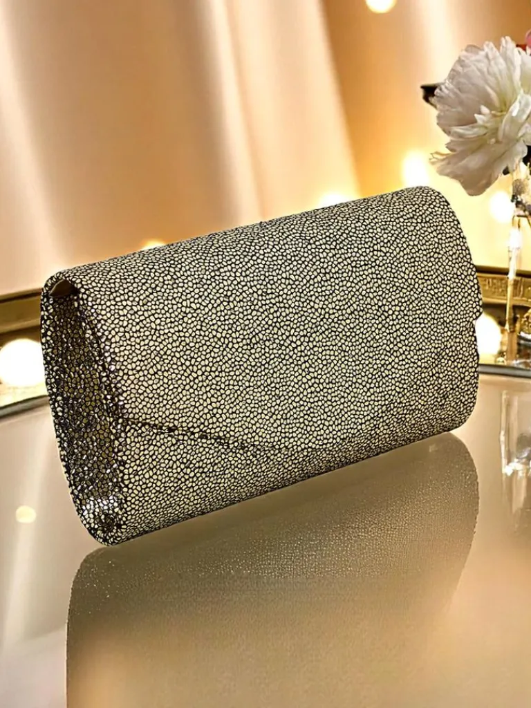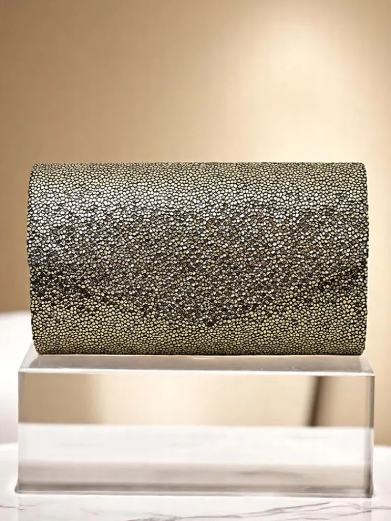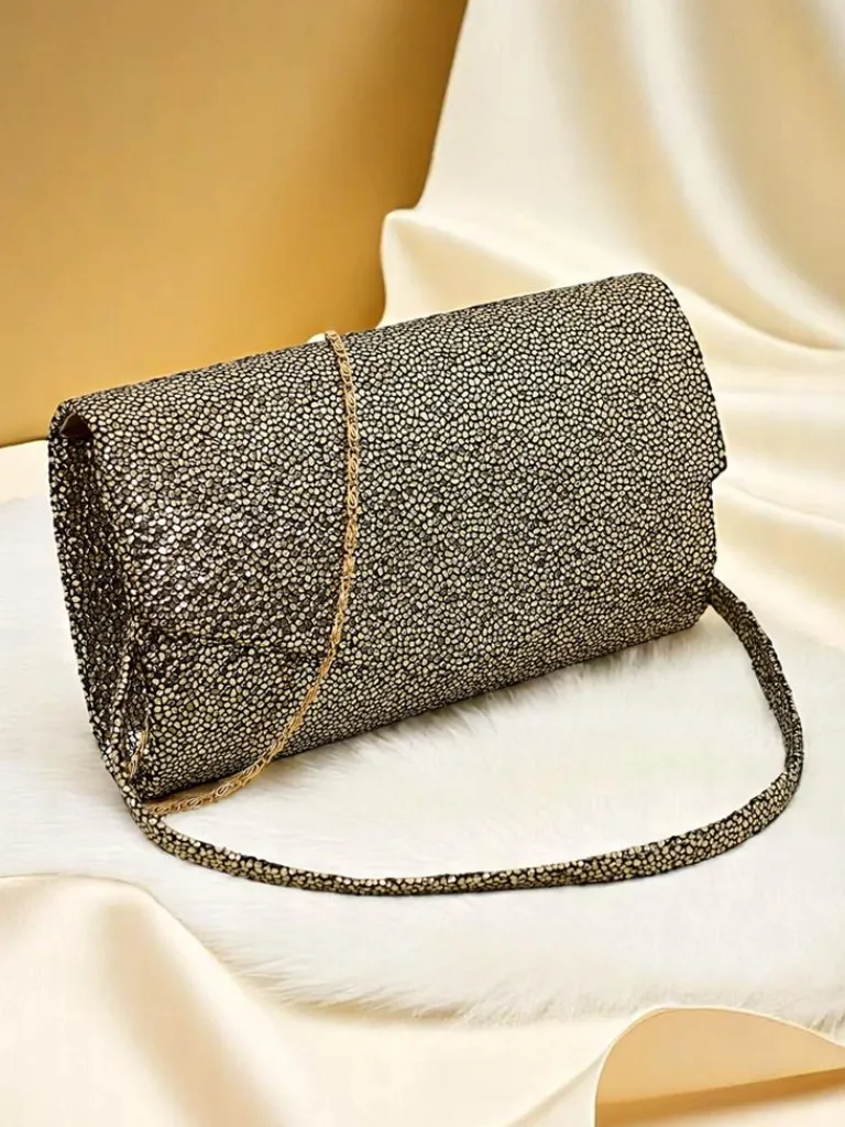- Błyszcząca kopertówka z eko skóry pokryta grubym brokatem. Zapinana na magnes, z odpinanym paskiem — idealna na wieczór pełen blasku i stylu.