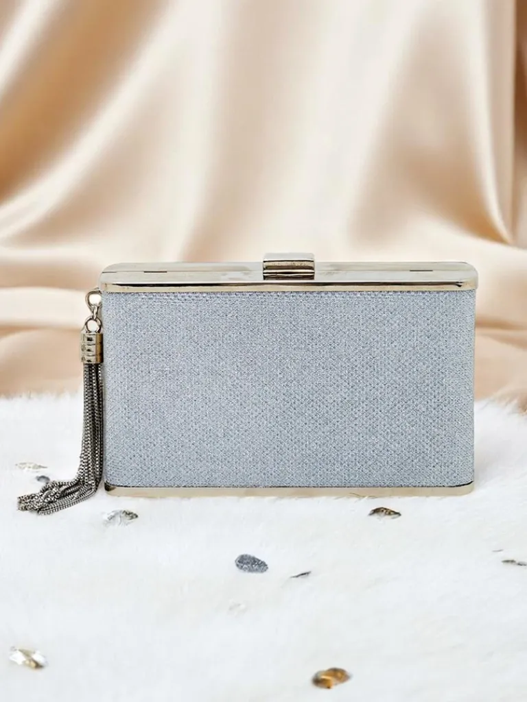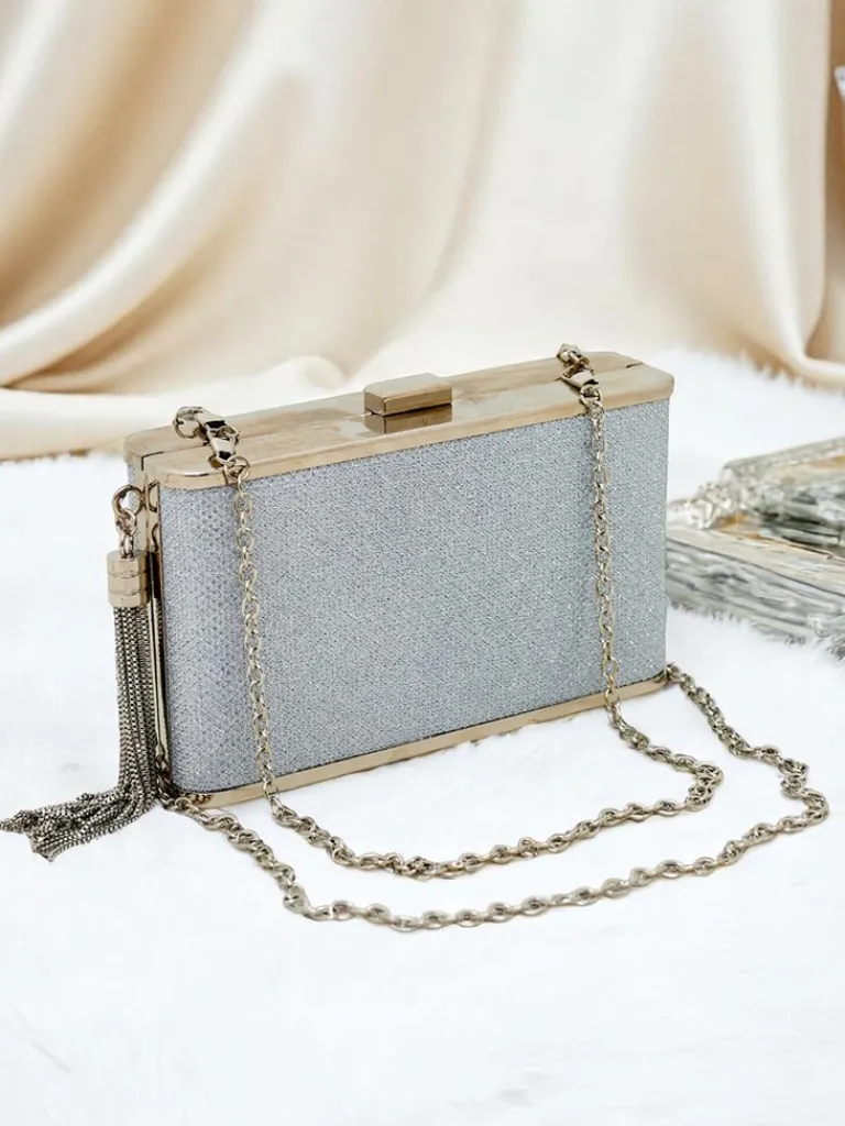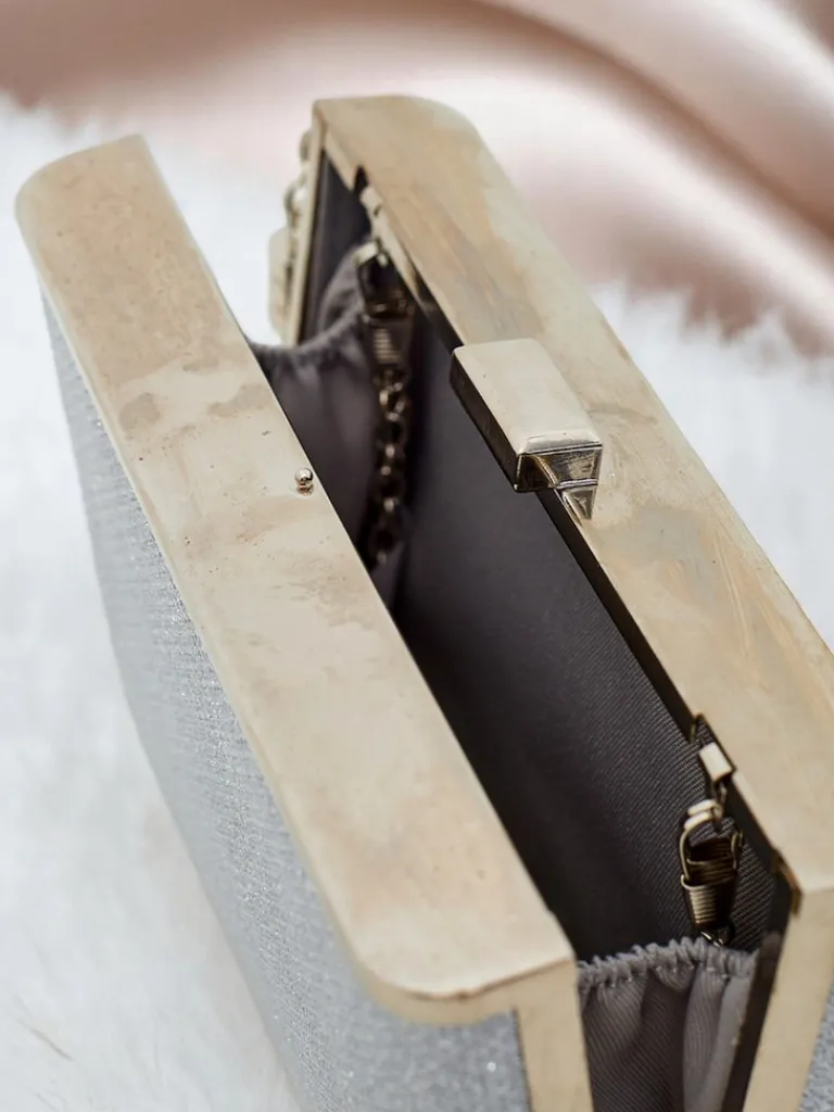 - Mała kopertówka z brokatową tkaniną, zapinana na zatrzask. Z odpinanymi paseczkami — noś ją w dłoni lub na ramieniu. Idealna na wieczór pełen blasku i elegancji!