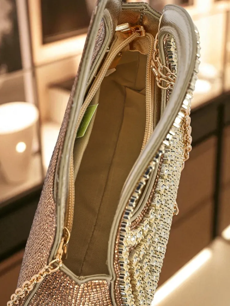 - Elegancka kopertówka z połyskującymi cyrkoniami, 1 komora, zamykana na zamek. Stylowe uszy i ozdobny łańcuszek dodają szyku. Idealna na wyjątkowe okazje – olśniewaj z klasą!