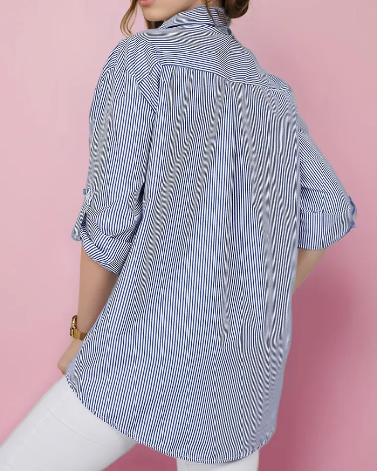 - Rewelacyjna damska koszula w paski z długimi rękawami. Model z kołnierzykiem, jest zapinany na guziki. Must have w szafie każdej kobiety!