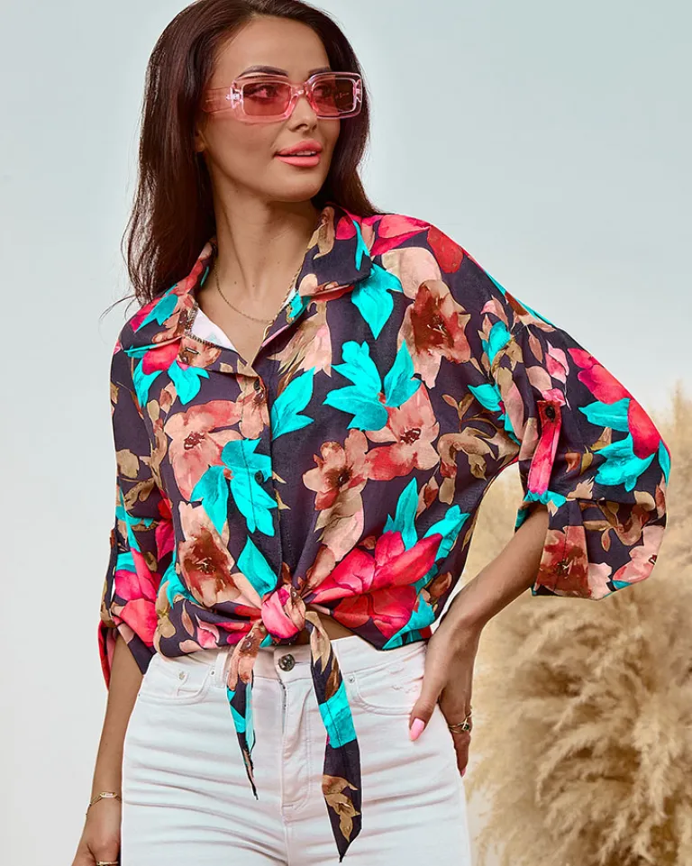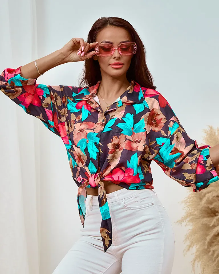 - Krótka damska bluzka a’la koszula z długimi, podwijanymi rękawami. Model z kołnierzykiem, jest zapinany na guziki oraz wiązany w talii. Zdobiony kwiecistym wzorem. Must have w szafie każdej kobiety!