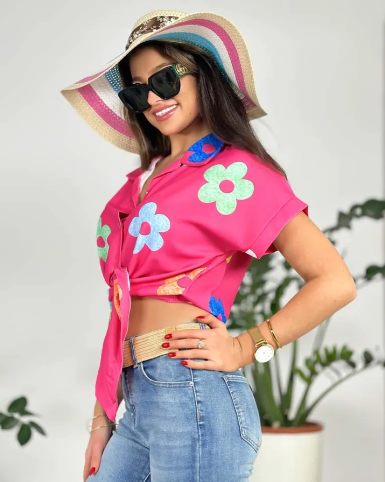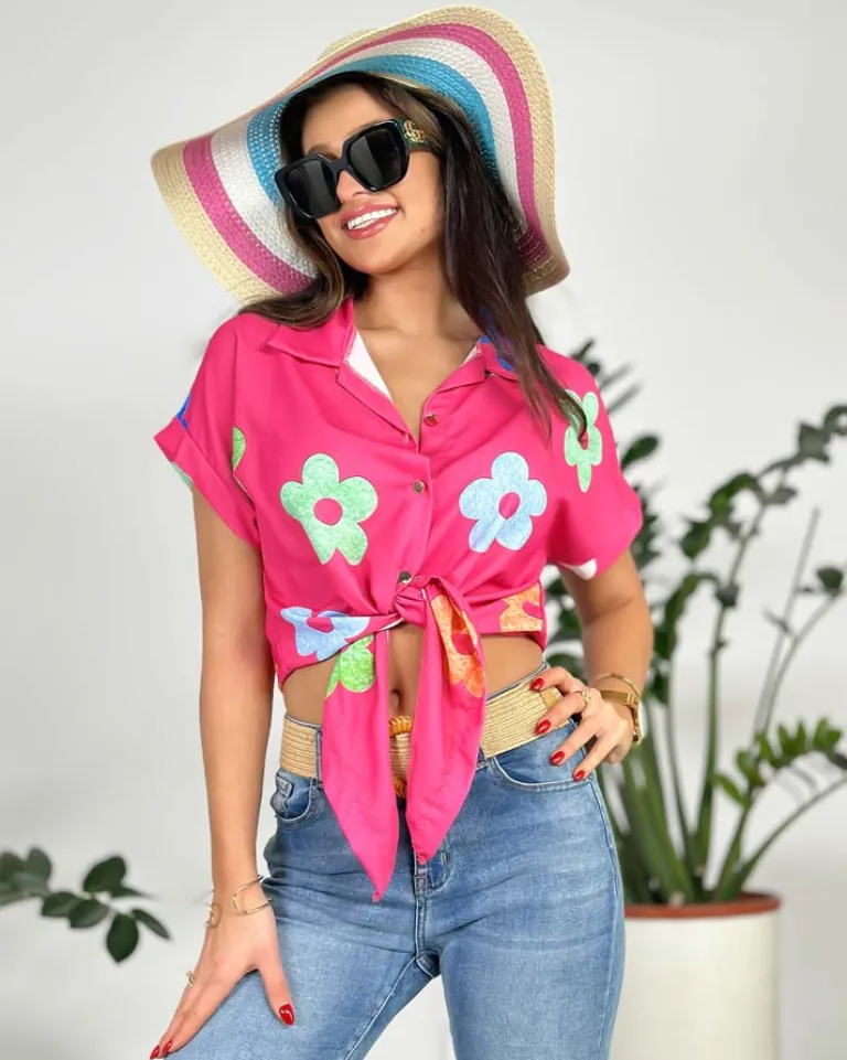 - Krótka damska bluzka a’la koszula z krótkimi rękawami. Model z kołnierzykiem, jest zapinany na guziki oraz wiązany w talii. Zdobiony kwiecistym wzorem. Must have w szafie każdej kobiety!