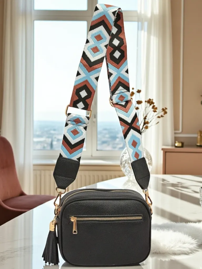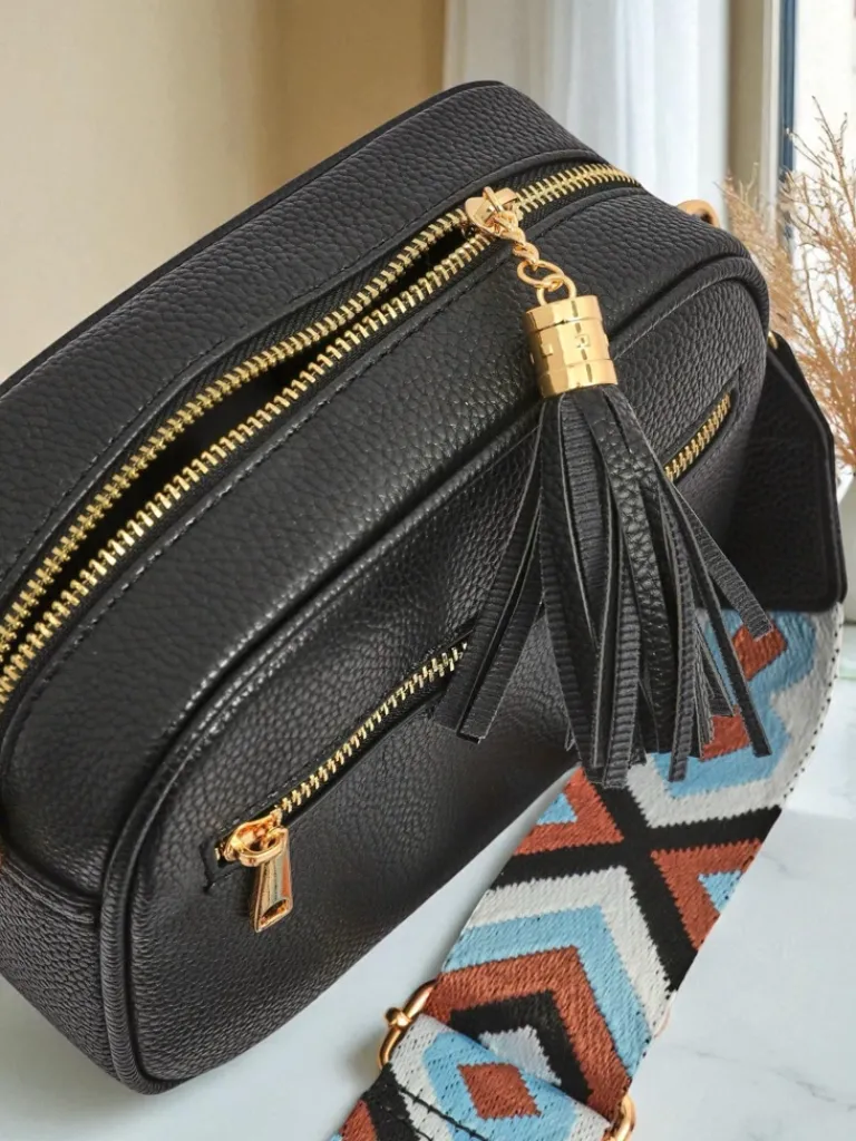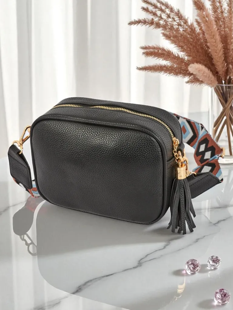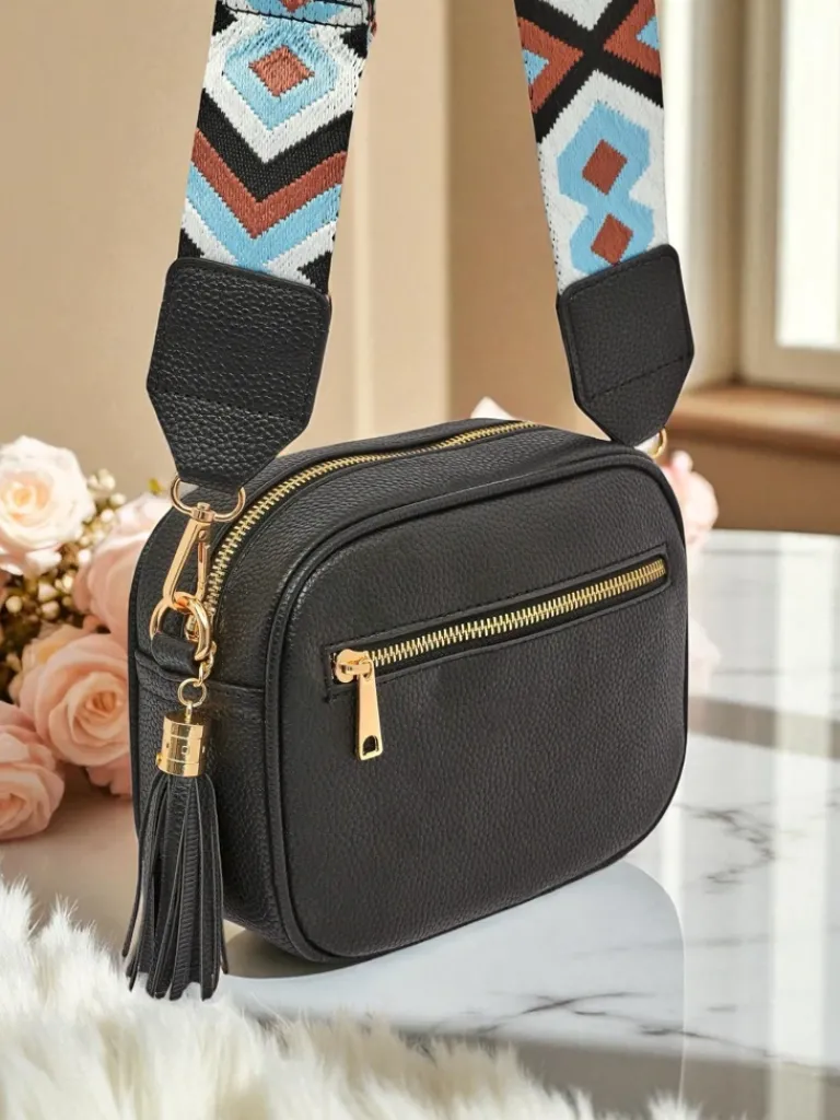 - Stylowa mała torebka z eko skóry z kolorowym paskiem i uroczym frędzelkiem. 1 komora, 2 kieszonki, regulowany i odpinany pasek. Idealna na co dzień i na wyjścia – kompaktowa, a pomieści wszystko, co ważne.
