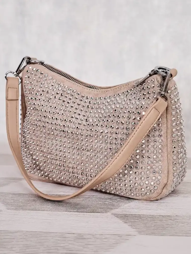 - Elegancka mała torebka damska zdobiona dżetami. Model z zapięciem na zamek, posiada 1 komorę i 2 kieszonki. Torebka posiada dwa, odpinane paski i ozdobną portmonetkę. Idealna na oficjalne wyjścia!