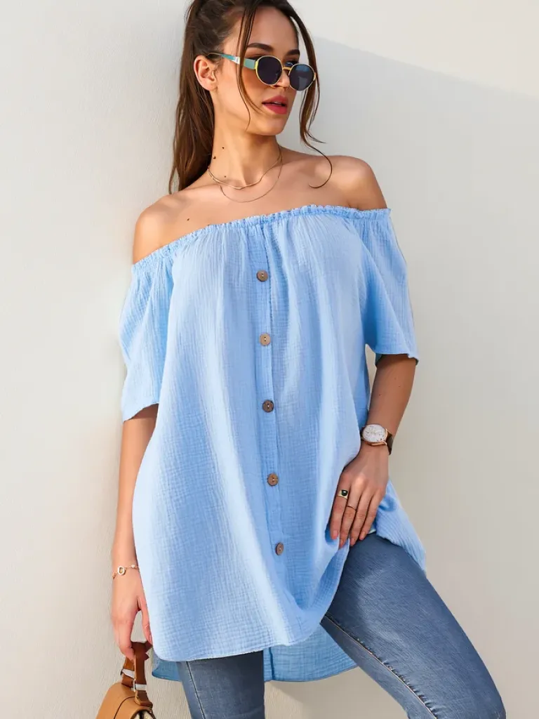 - Elegancka bawełniana bluzka damska a’la hiszpanka z subtelnymi, ozdobnymi guzikami. Idealna na ciepłe dni, łączy komfort z kobiecym, romantycznym stylem.