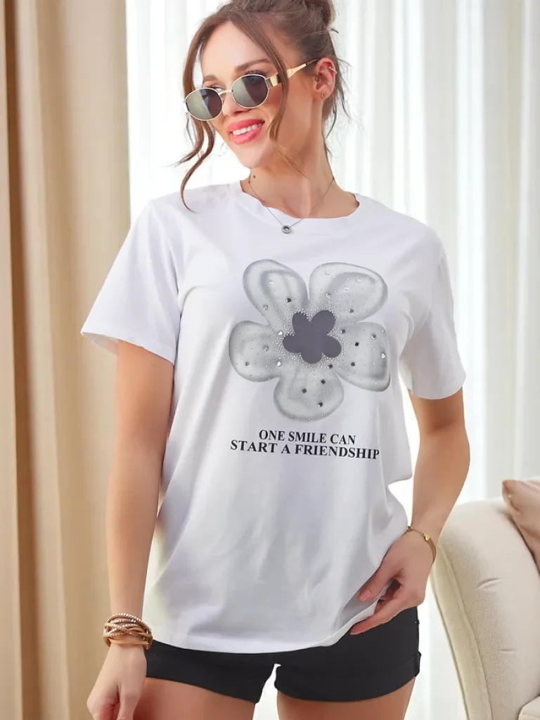 New Bawełniany damski t-shirt z kwiatuszkiem Bluzki / Koszule / Koszulki