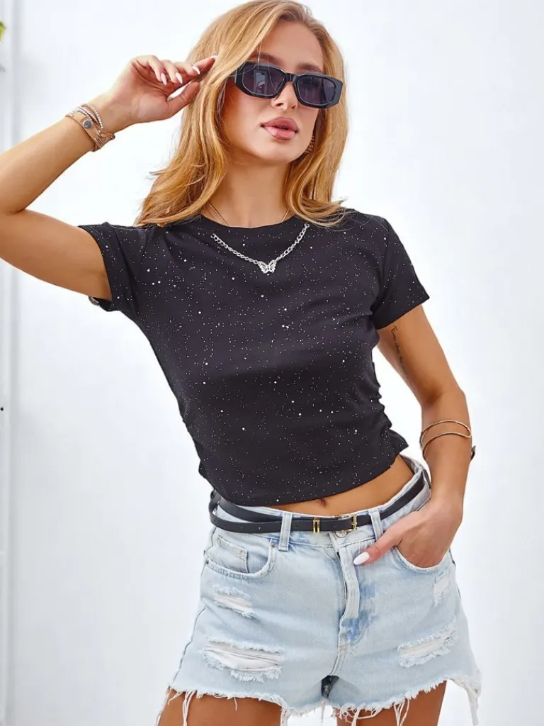 New Bawełniany damski t-shirt z marszczeniami po bokach, łańcuszkiem i brokatem Bluzki / Koszule / Koszulki