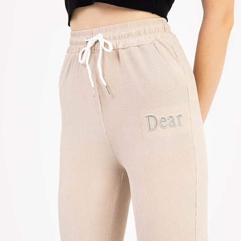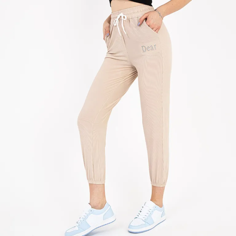 - Damskie spodnie materiałowe z napisem, materiał wykonania to przewiewna tkanina. Spodnie posiadają szeroką gumkę w pasie utrzymującą je we właściwym miejscu oraz na nogawkach. Dodatkowo wiązanie w pasie. UWAGA: Dokładność pomiaru (+/-) 1 cm.