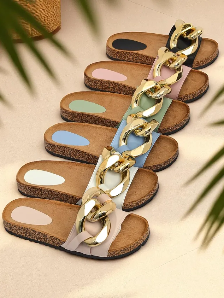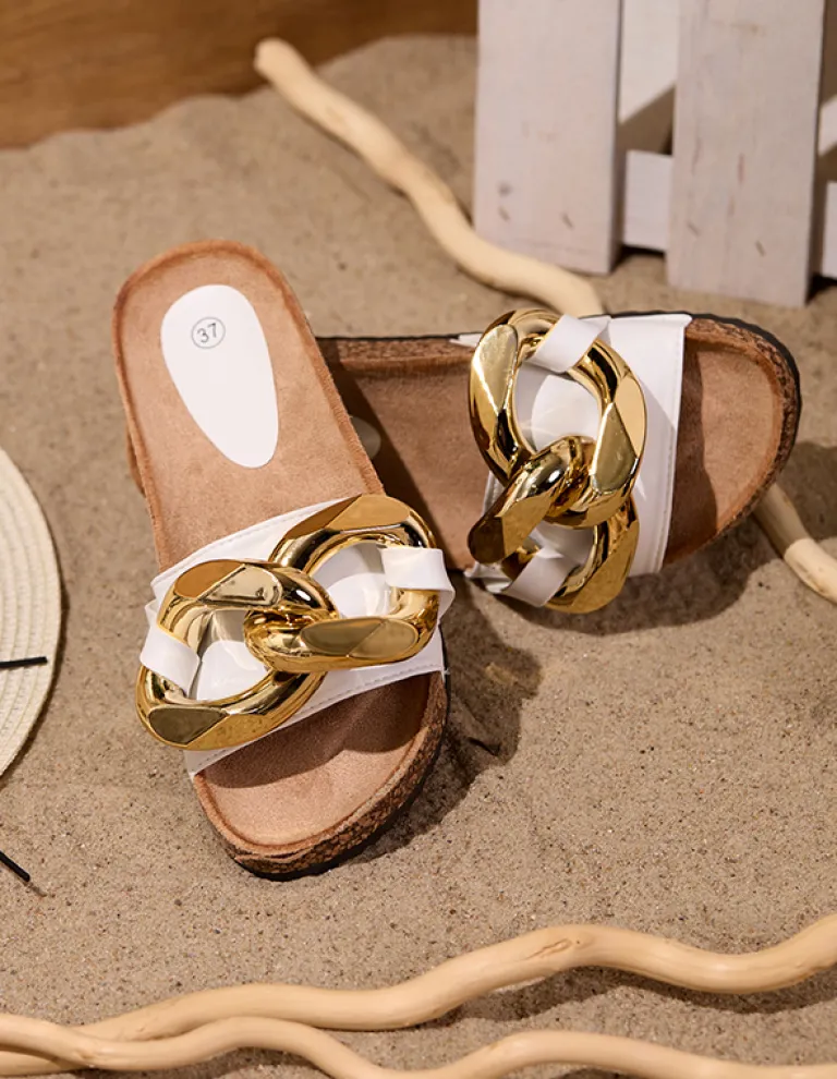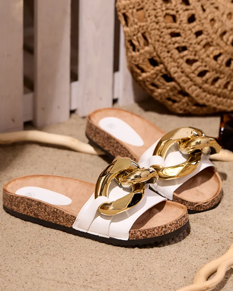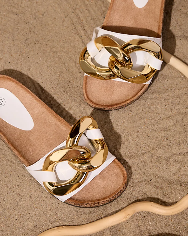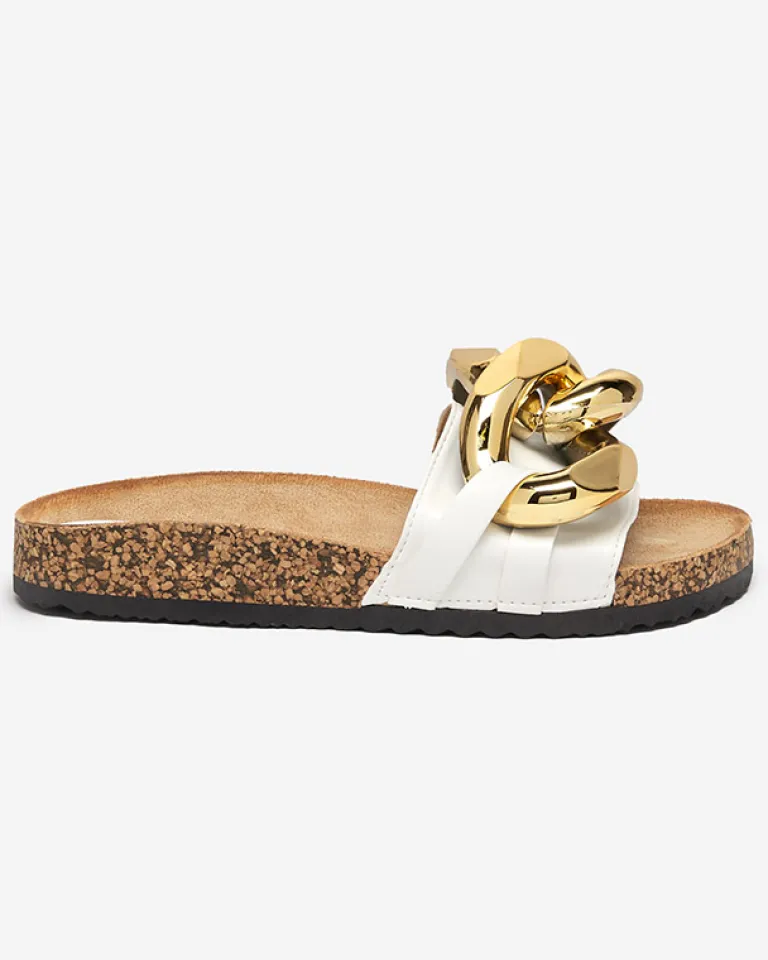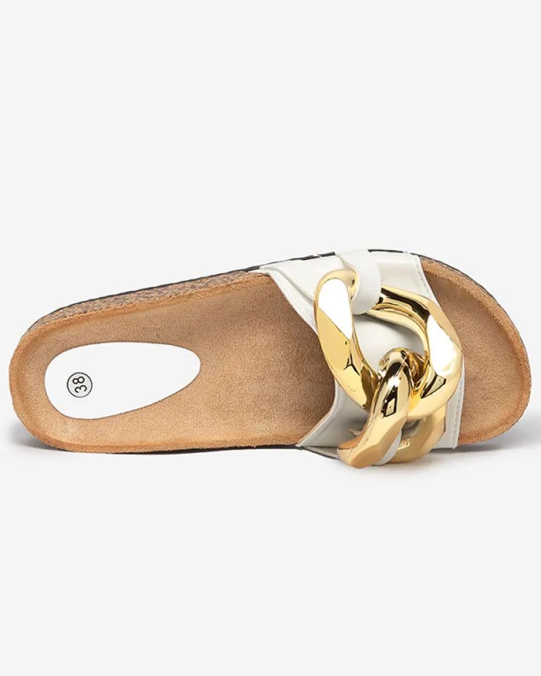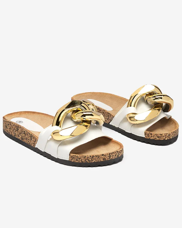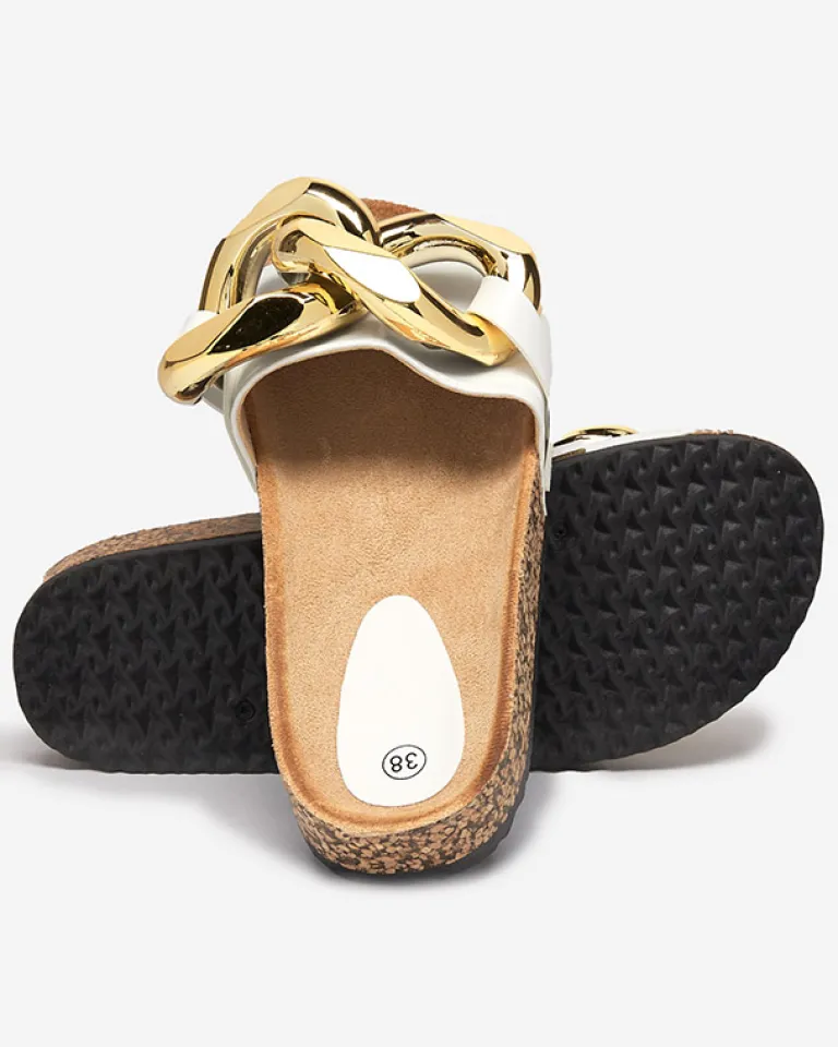 - Stylowe klapki damskie wykonane ze skóry ekologicznej, posiadają złotą ozdobę na paseczku. Model na płaskiej i gumowej podeszwie z materiału a’la korek. Świetny dodatek do wielu letnich stylizacji!