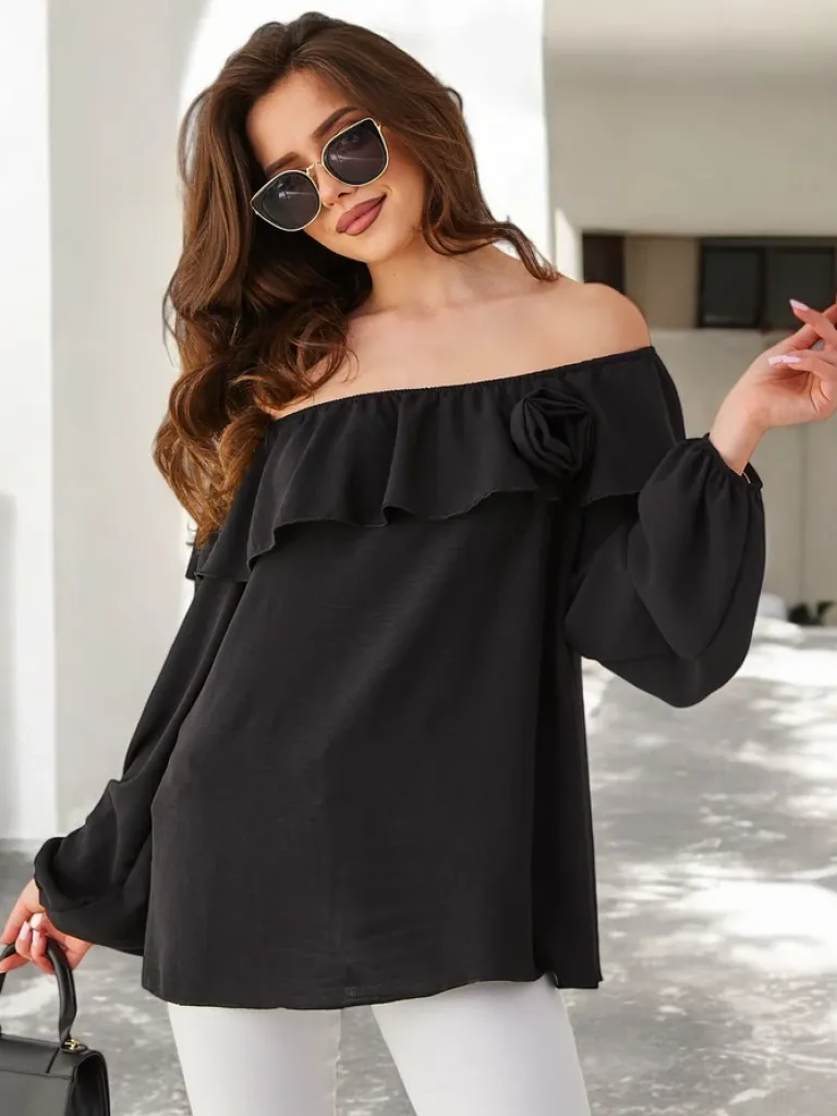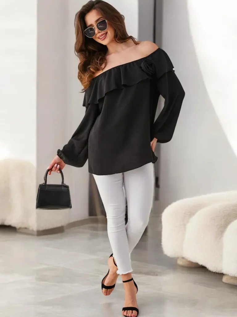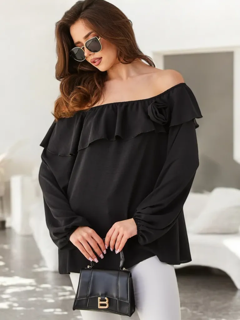 - Bluzka hiszpanka z falbanką przy dekolcie to elegancka i kobieca propozycja na każdą okazję. Z gumką przy dekolcie i długimi rękawami, idealnie dopasowuje się do sylwetki, zapewniając komfort i swobodę ruchów. Subtelna falbanka dodaje lekkości i uroku!