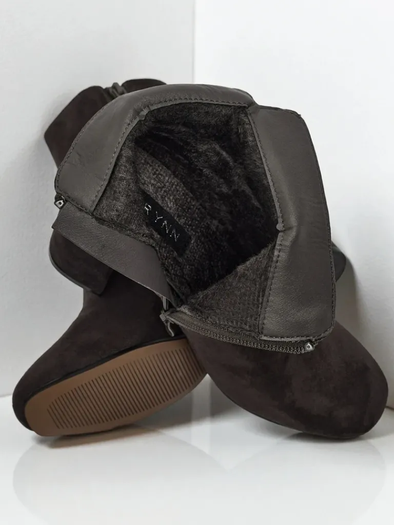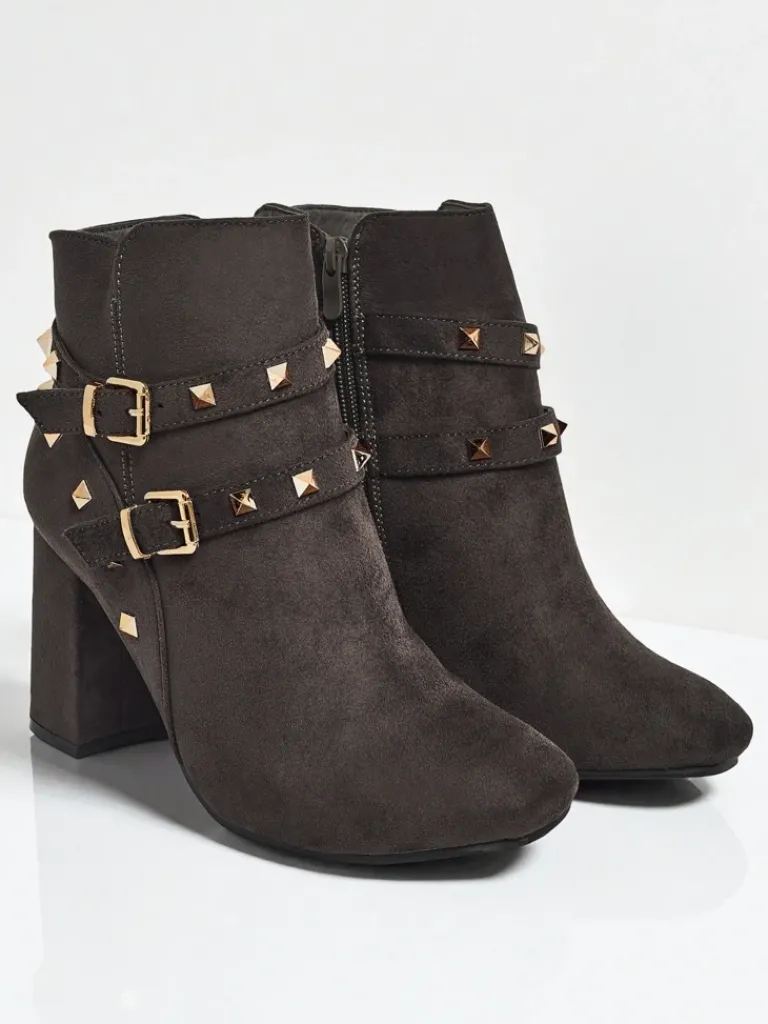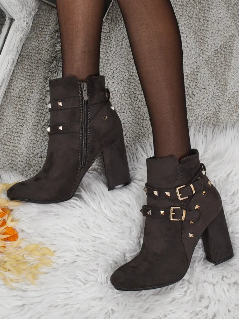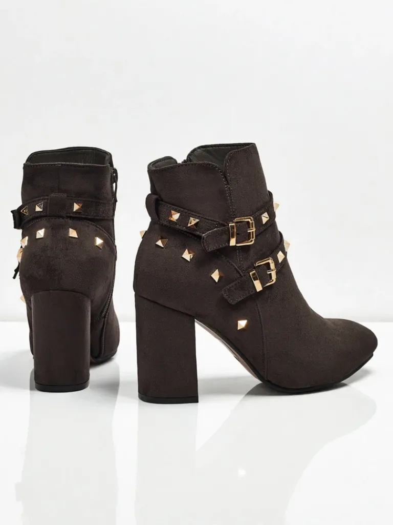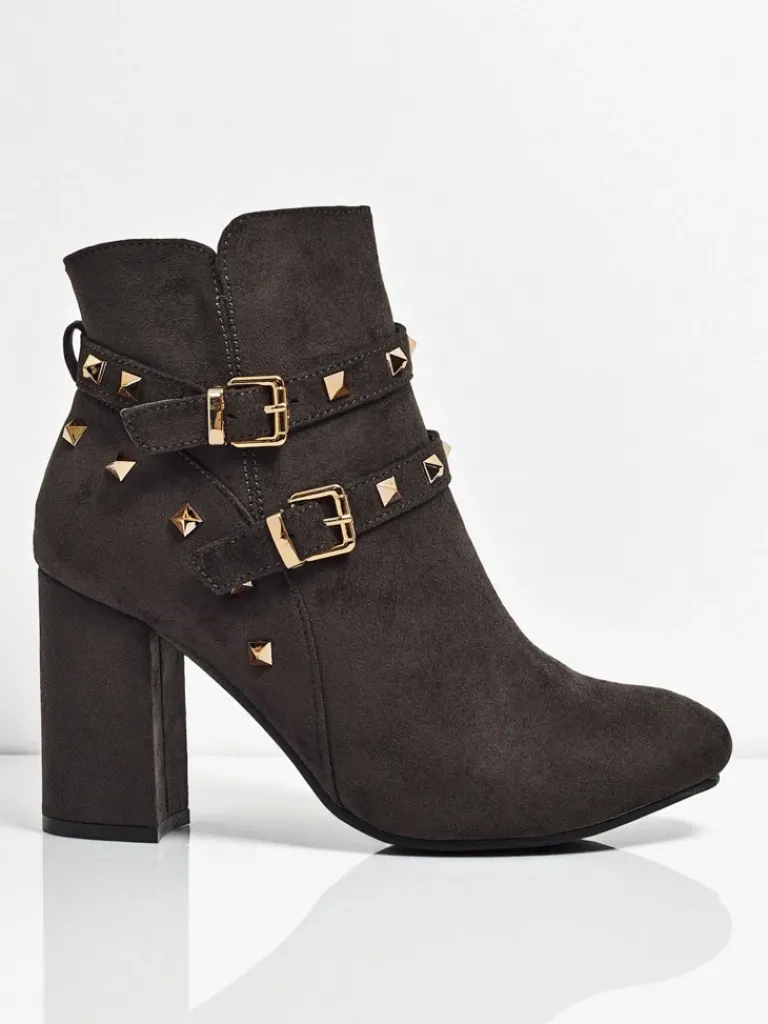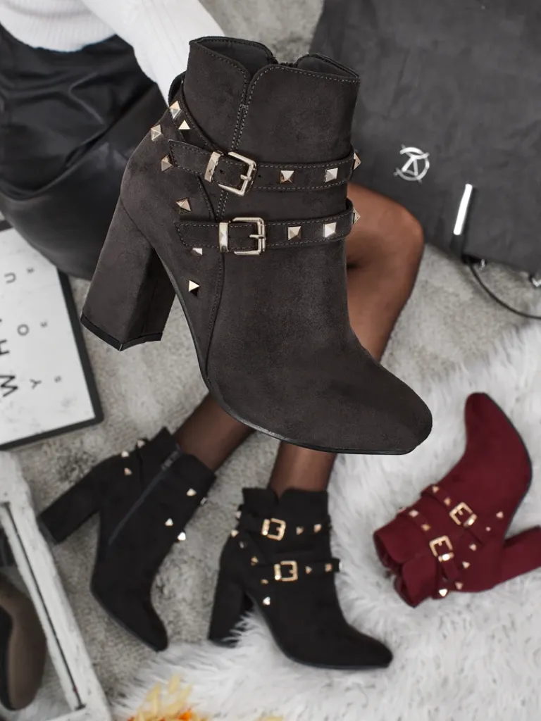 - Wygodne botki na słupku, wykonane z eko skóry zamszowej. Model zapinany na zamek. Model posiada delikatne ocieplenie w formie futerka oraz ozdobne paseczki z dżetami na cholewce. Idealny wybór na jesień!