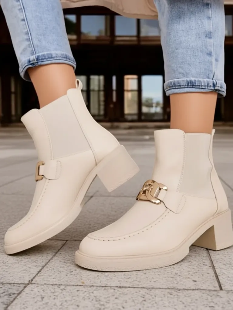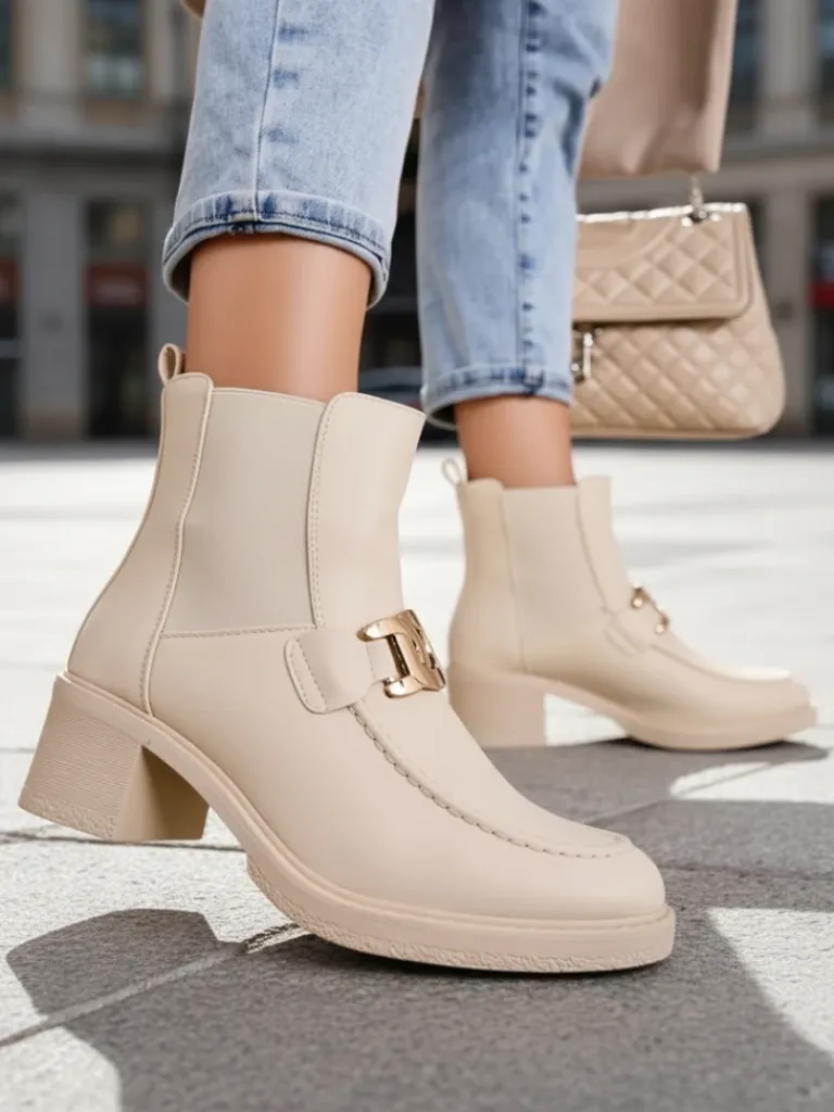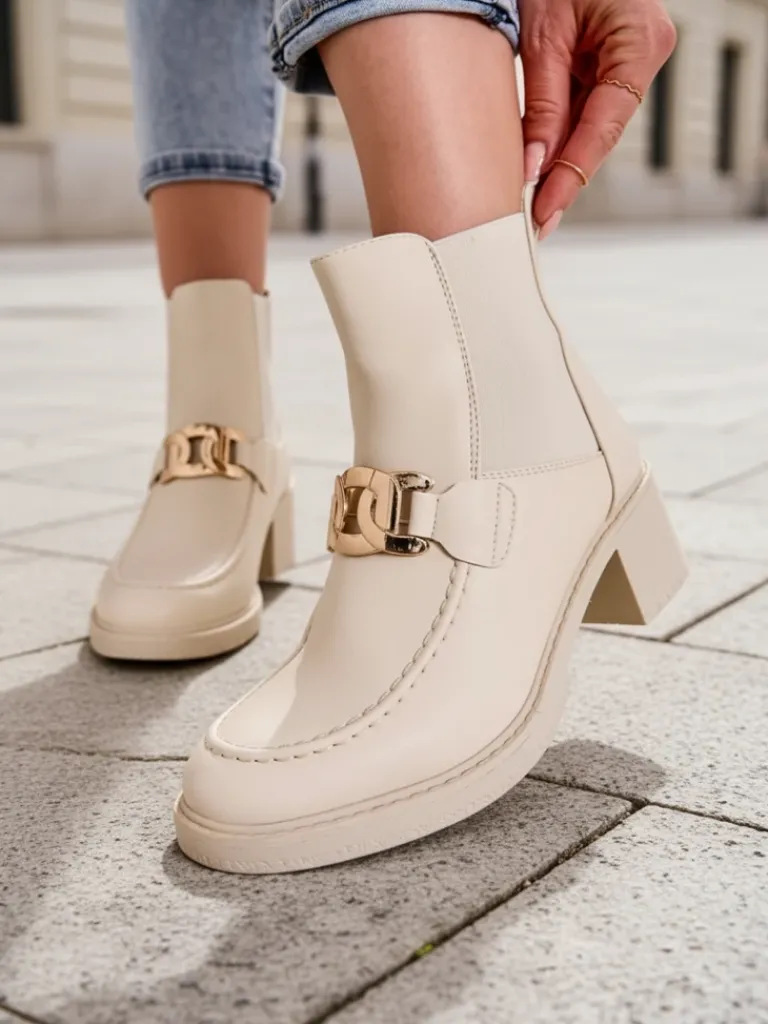 - Stylowe damskie botki na niskim słupku. Cholewka wykonana ze skóry ekologicznej. Środek wypełniony delikatnym futerkiem. Model posiada subtelną ozdobę na cholewce. Obuwie wsuwane, nosek okrągły. Świetny wybór na jesień!
