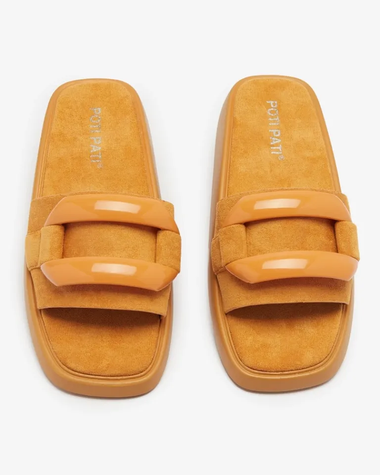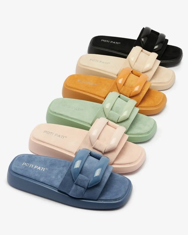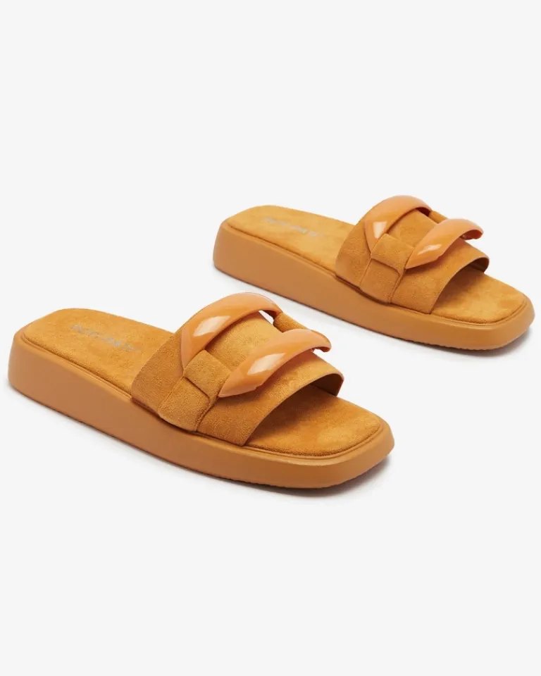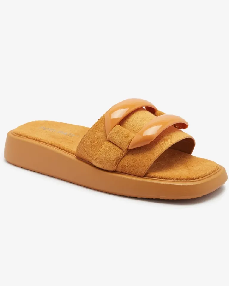 - Stylowe damskie klapki na płaskiej podeszwie z dużą plastikową ozdobą – świetne do szerokich spodni i krótkiego topu! Paseczek i wkładka z eko-zamszu, nosek kwadratowy, podeszwa gumowa.
