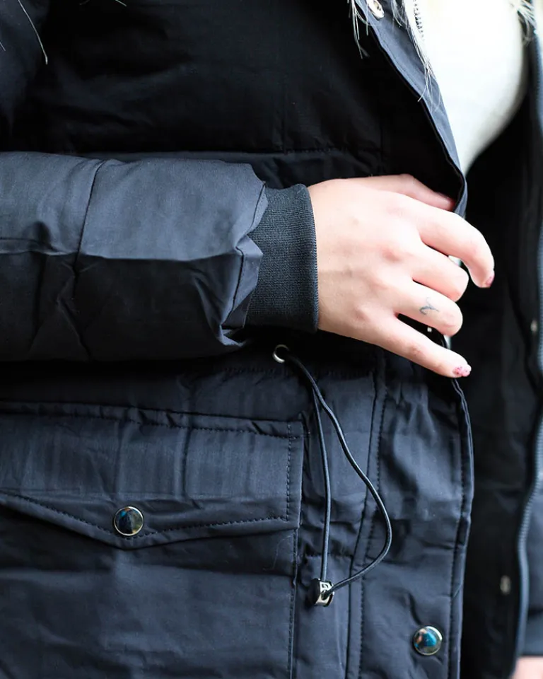 - Stylowa damska długa, pikowana kurtka z kapturem. Produkt z 2 zapinanymi kieszeniami, posiada wypełnienie z puchu syntetycznego. W pasie regulowany ściągacz, wewnątrz rękawa bawełniane gumy ściągające. Dokładność pomiaru (+/-) 1 cm.
