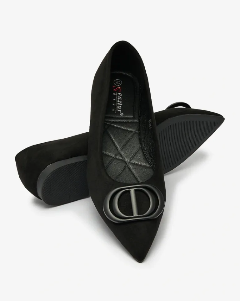- Balerinki damskie na płaskim obcasie w całości wykonane ze skóry ekologicznej zamszowej. Nosek w szpic i zdobiony metalową klamrą. Super dodatek do Twoich casualowych outfitów!