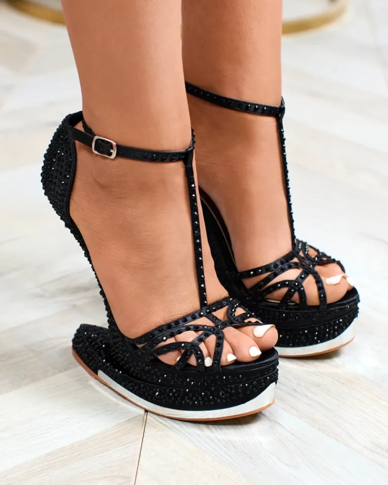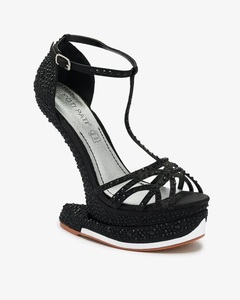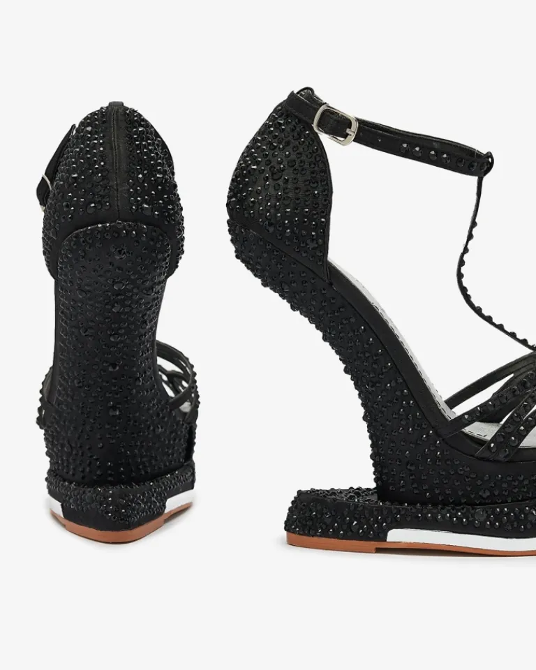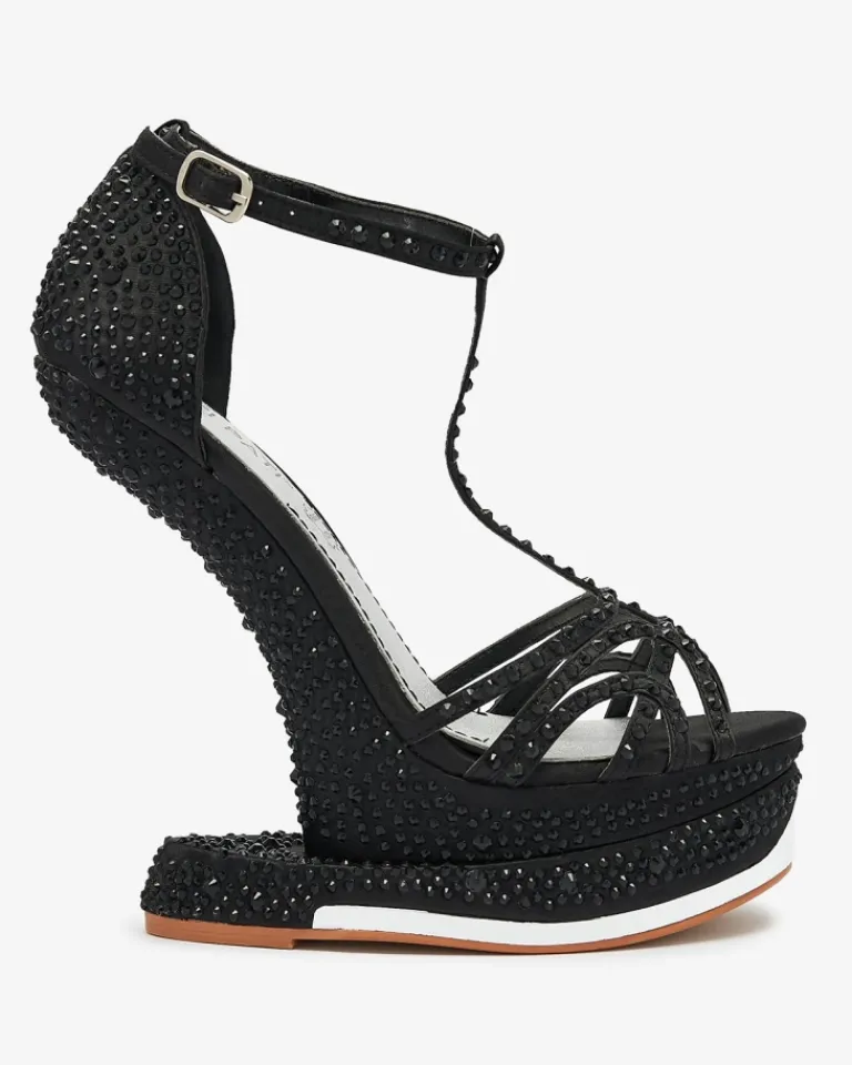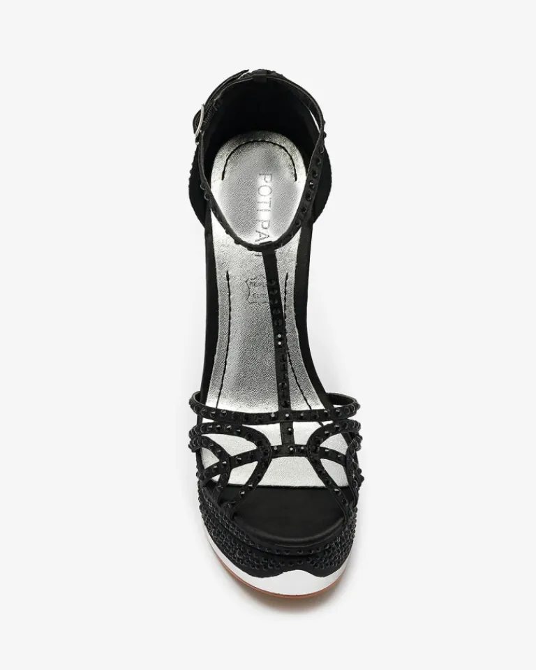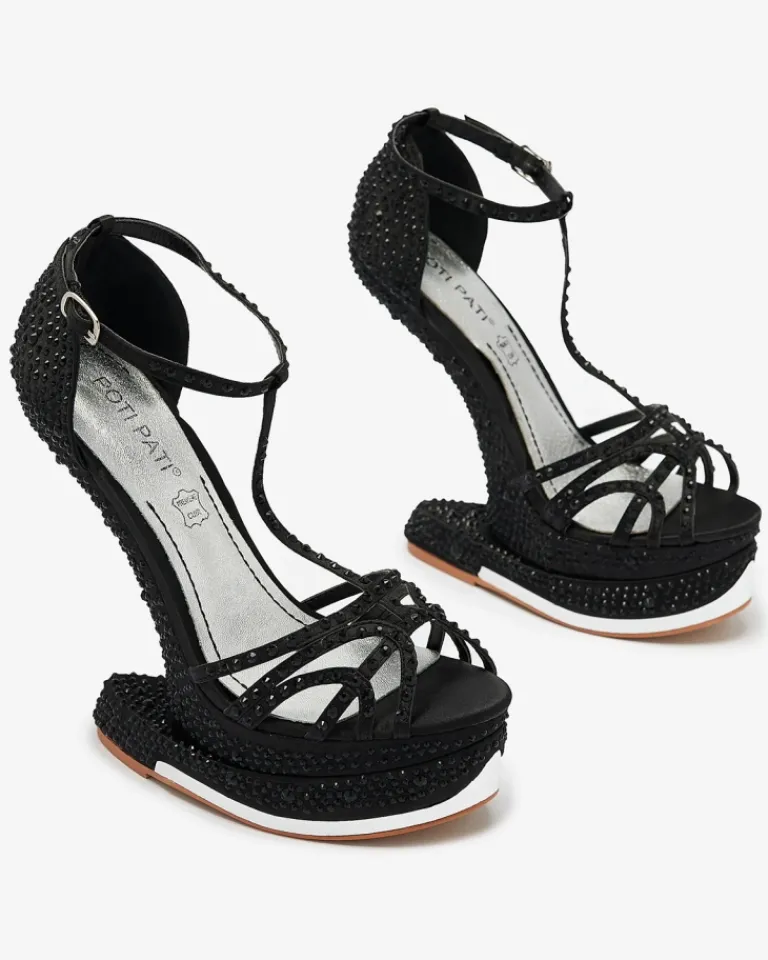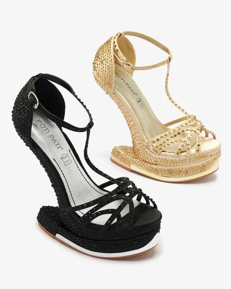 - Jedyne w swoim rodzaju czółenka damskie wykonane z tkaniny, wkładka ze skóry naturalnej. Model zdobiony cyrkoniami, posiada platformę oraz niewidoczny wysoki obcas. Obuwie zapinane sprzączką wokół kostki.