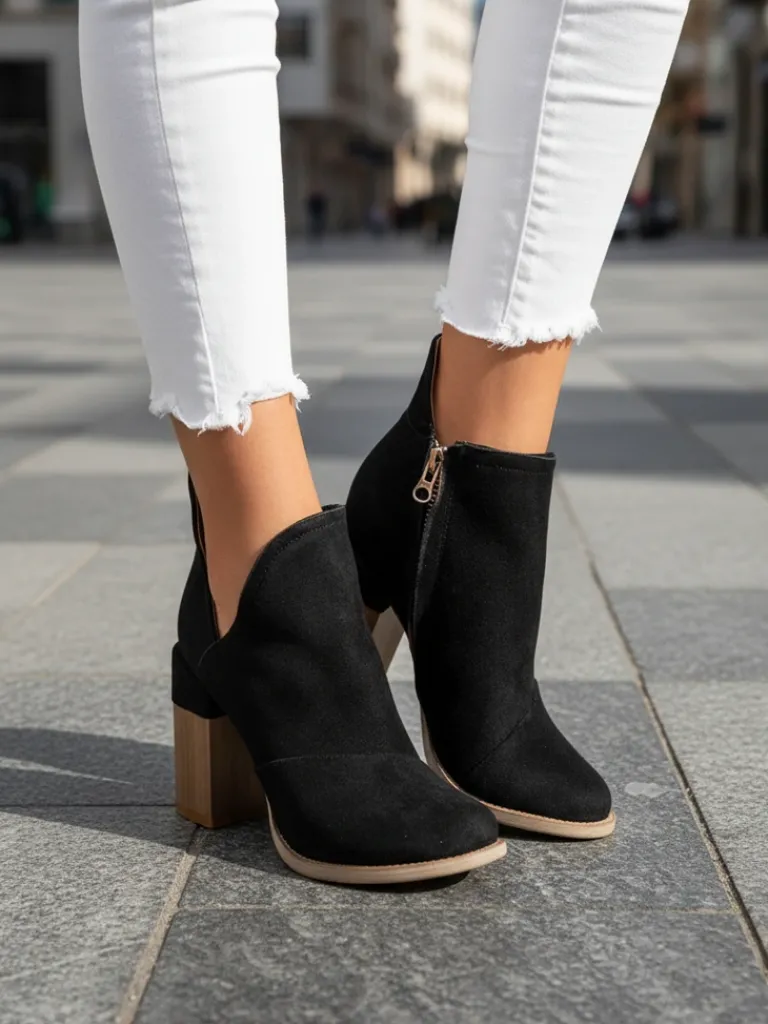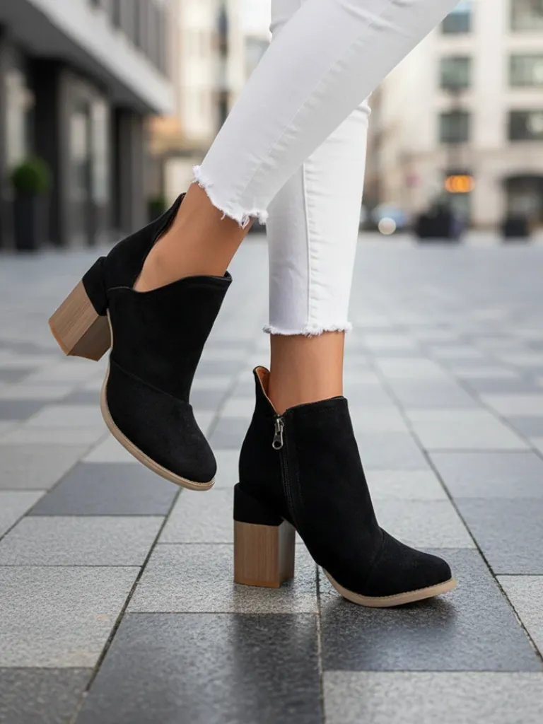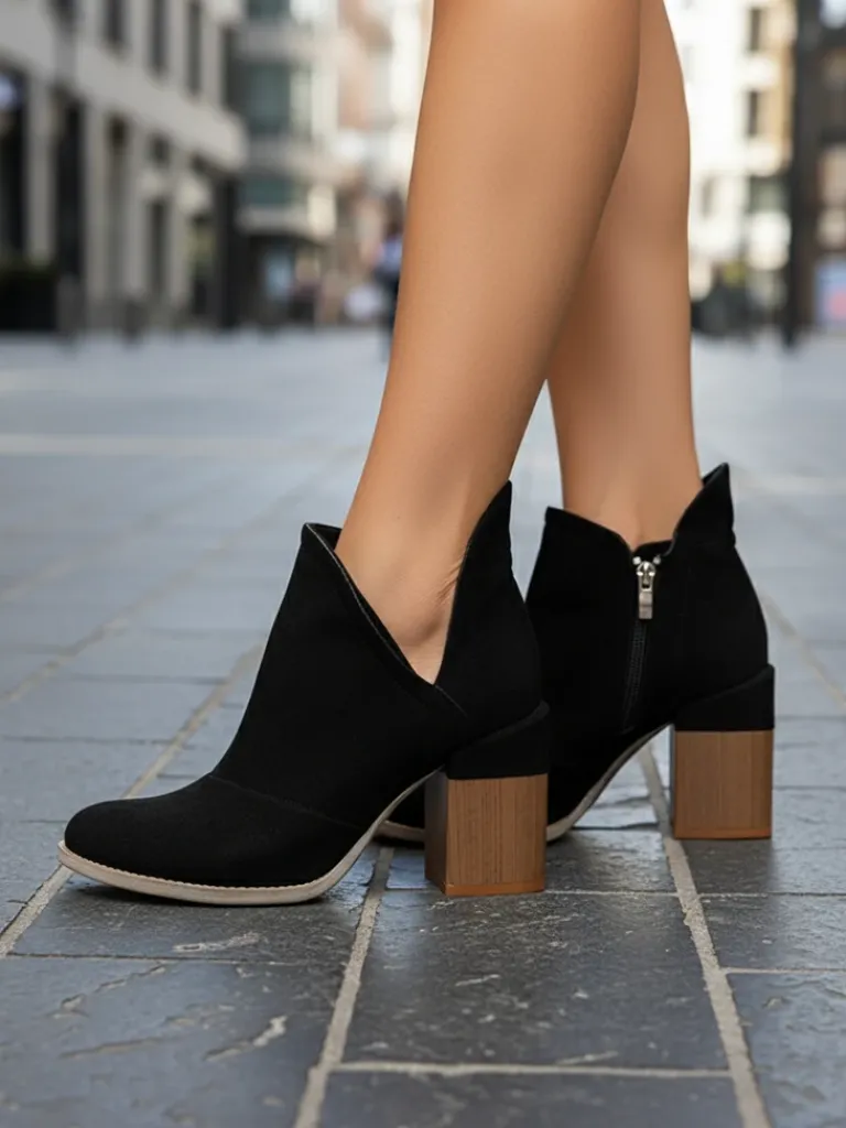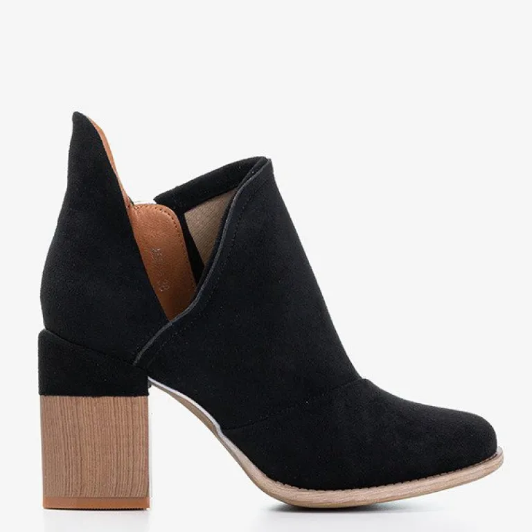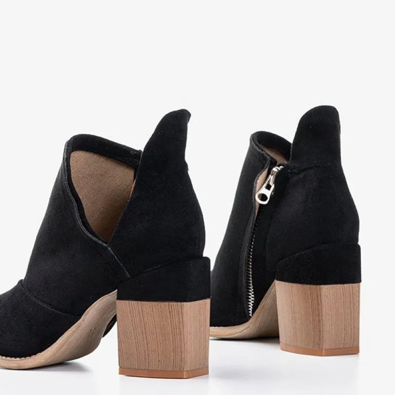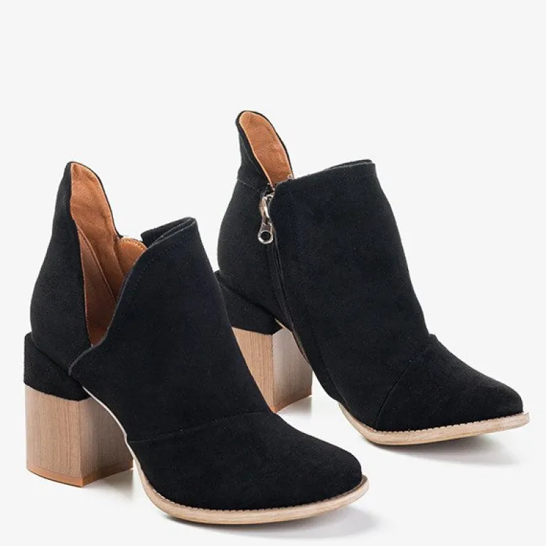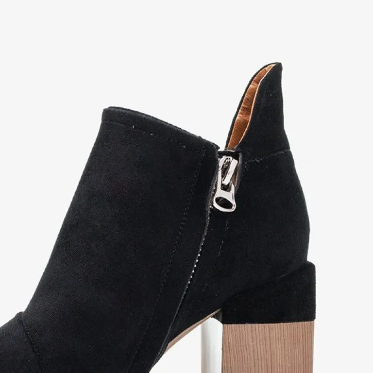 - Oryginalne damskie botki na słupku z okrągłym noskiem. Materiał wykonania to eko-skóra zamszowa, w środku eko-skórzana wkładka. Cholewka zapinana suwakiem, po boku posiada wycięcia. Idealny dodatek do jesiennych stylizacji.