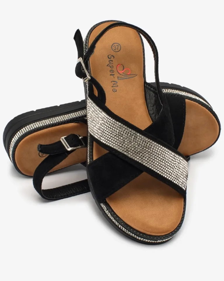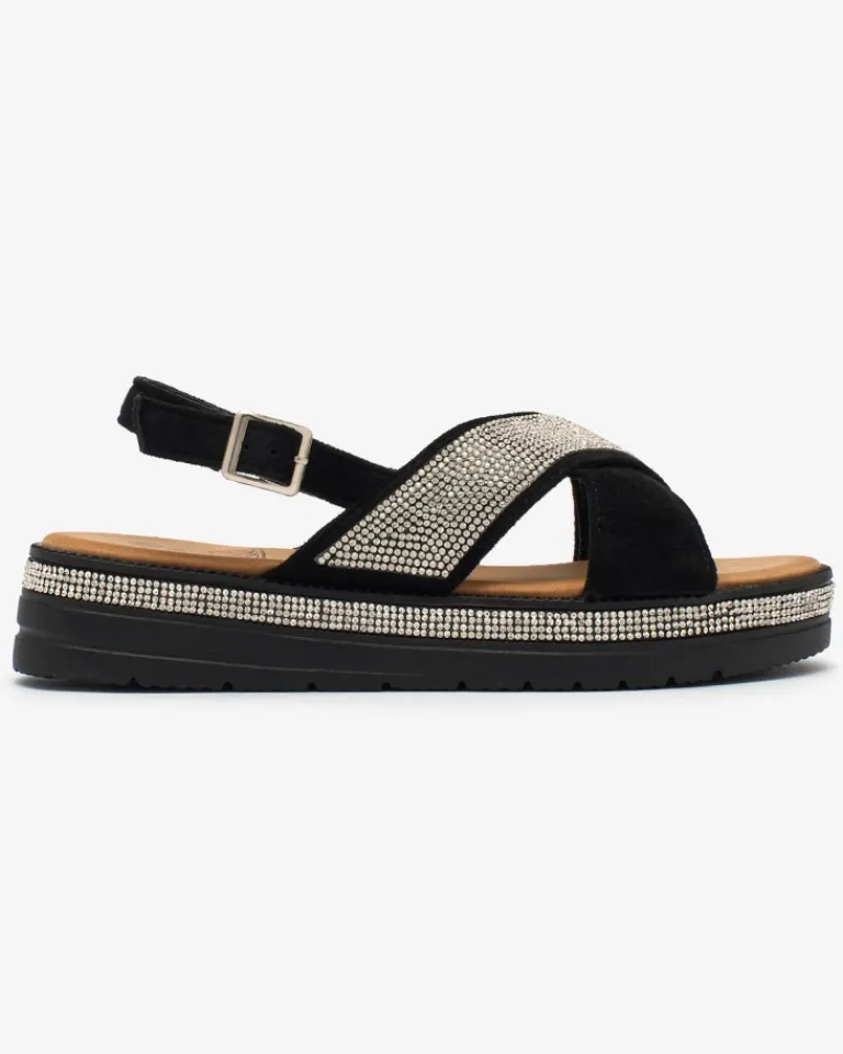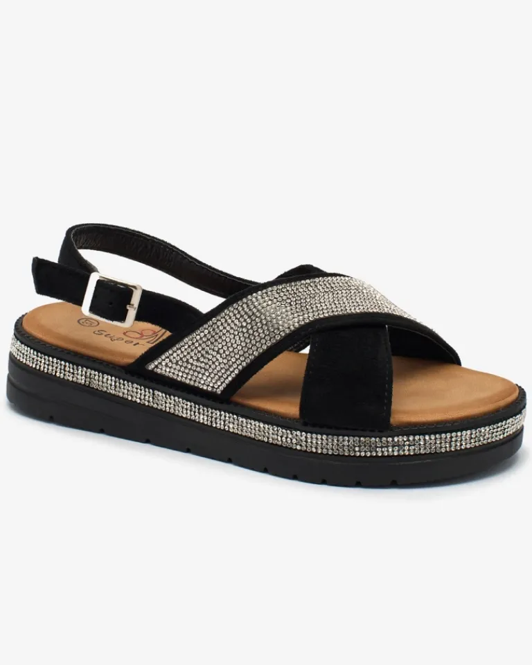 - Przepiękne damskie sandały zdobione cyrkoniami. Paseczki wykonane są ze skóry ekologicznej zamszowej, wkładka to skóra ekologiczna. Para zapiana jest na sprzączkę na wysokości kostki. Będą świetną ozdobą do codziennych stylizacji.