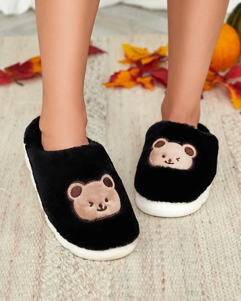 - Wyjątkowe damskie kapcie na płaskiej podeszwie, zdobione naszywką z misiem. Model wykonany z materiału imitującego futerko. Świetna propozycją dla domowych outfitów!
