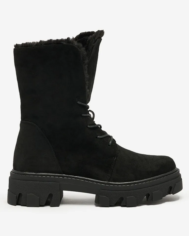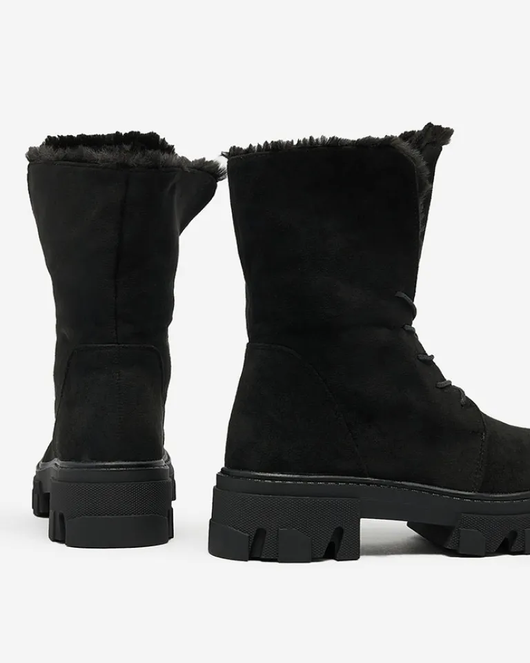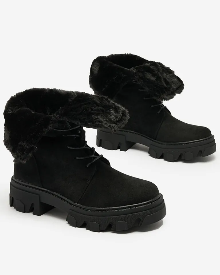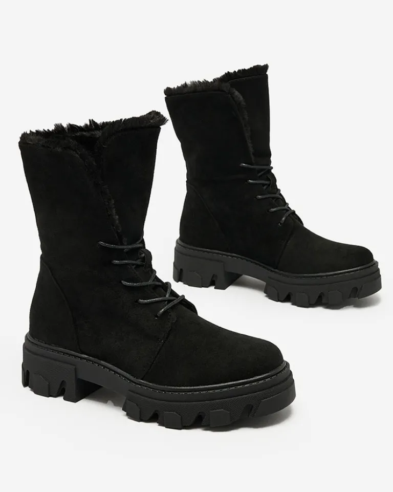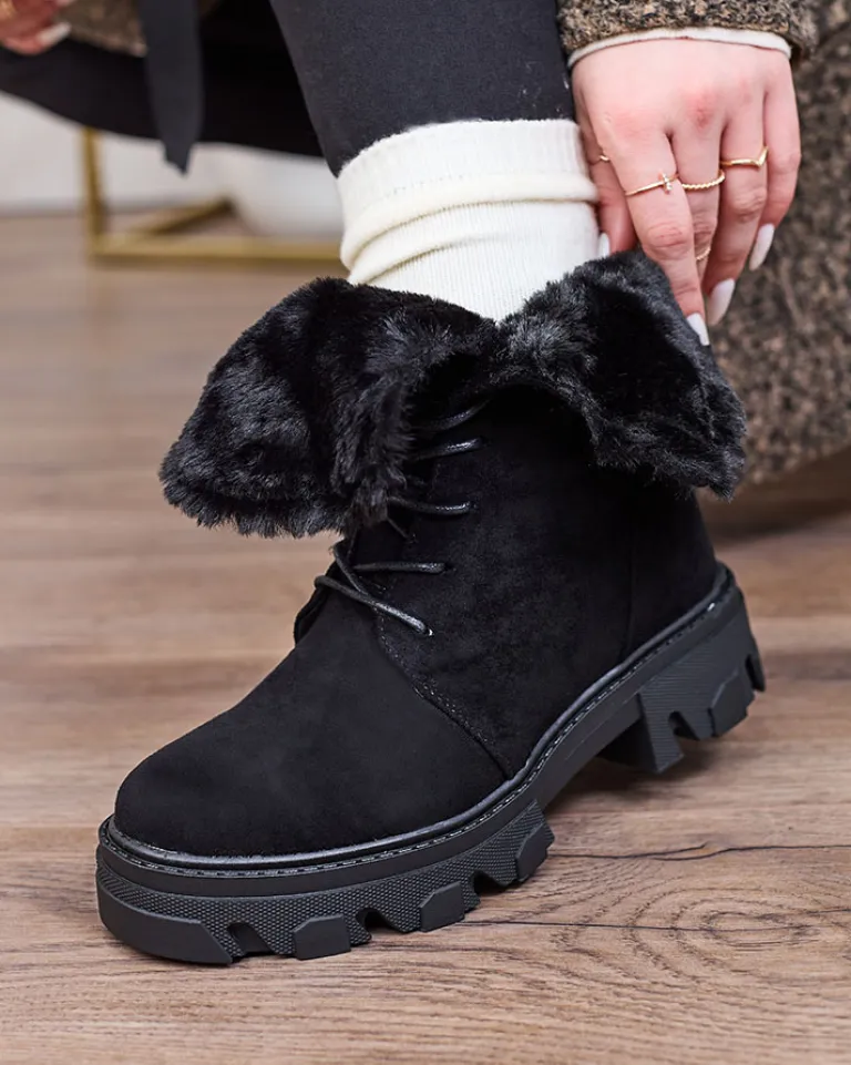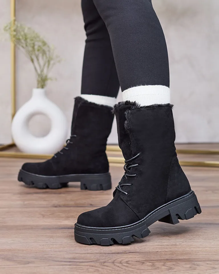 - Stylowe botki wykonane z eko skóry zamszowej. Buty są sznurowane, posiadają grubszą, gumową podeszwę oraz środek wypełniony delikatnym futerkiem. Idealne na jesień!