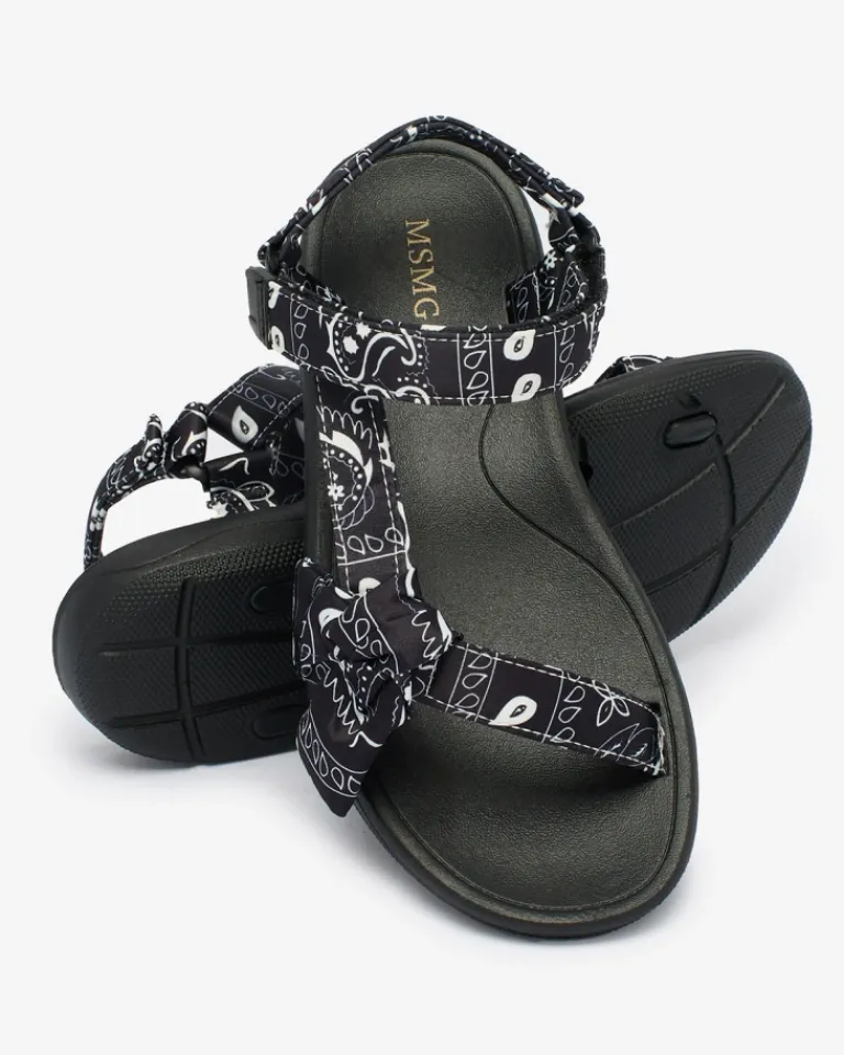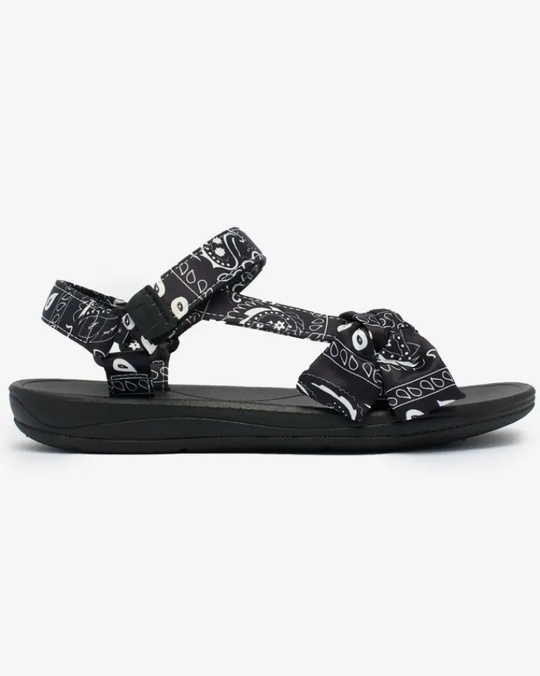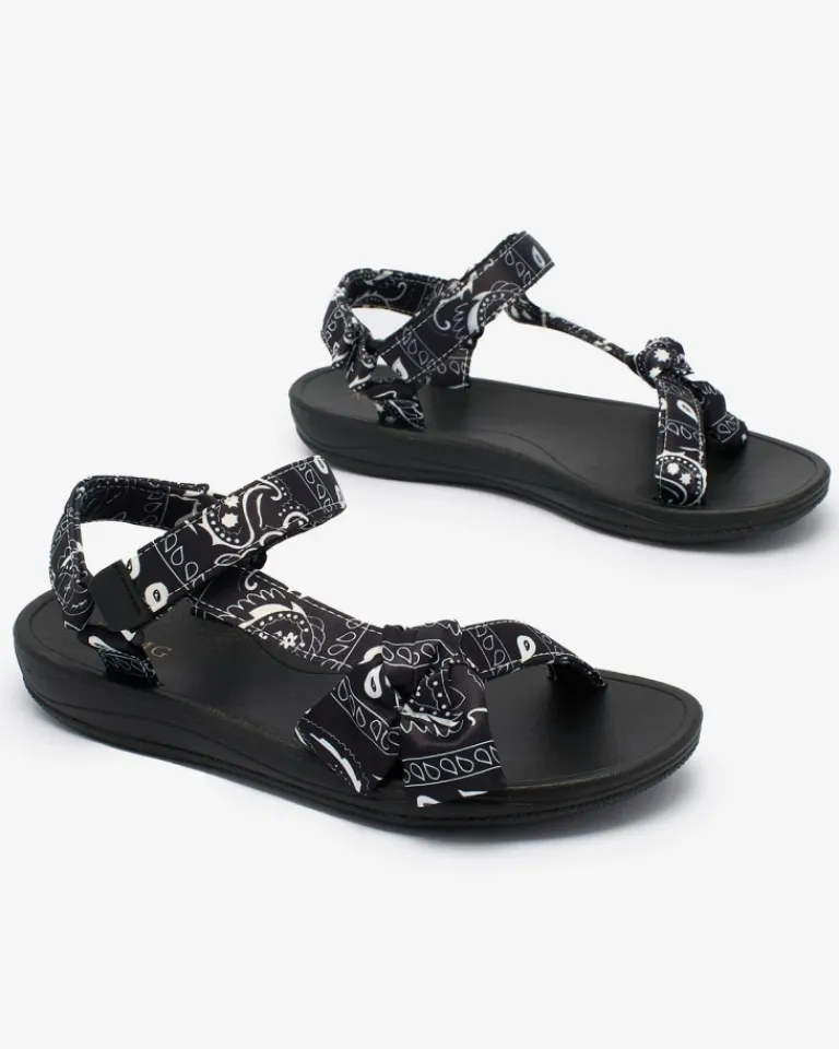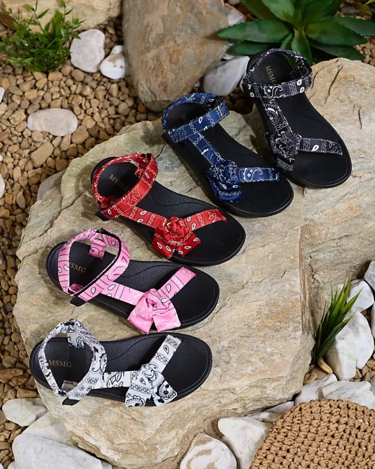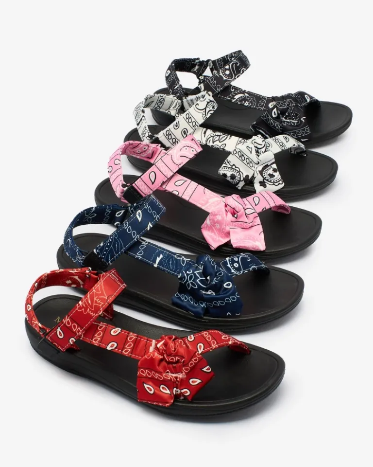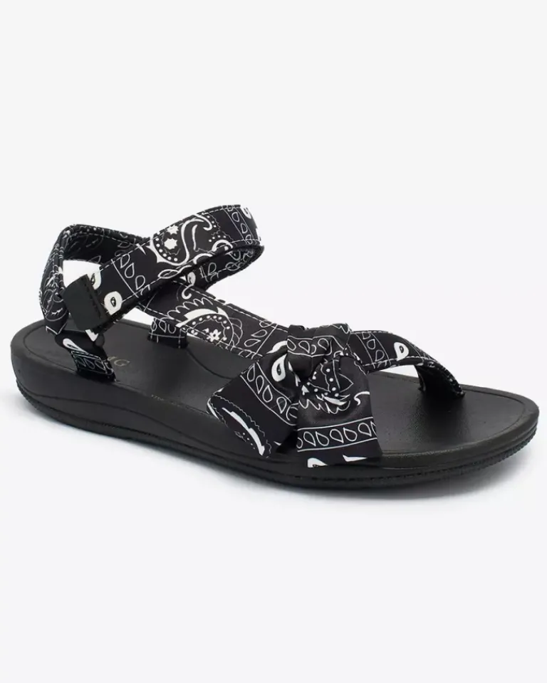 - Sportowe damskie sandały na gumowej podeszwie. Paseczki są wykonane z materiału tkaninowego z printem i zdobione kokardką. Prezentowane obuwie damskie jest zapinane na rzepy. Dobrze przylegają do stopy!