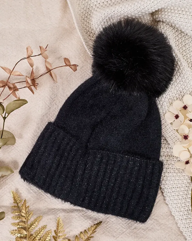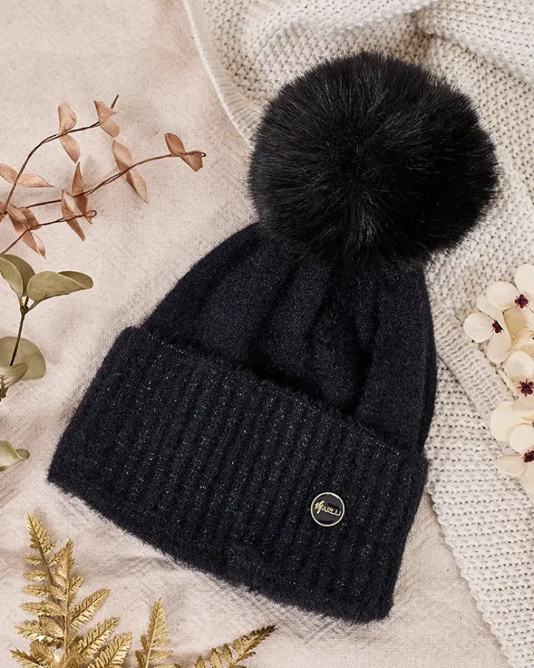 - Przepiękna damska czapka zimowa, wykonana z przyjemnej dzianiny. Model zdobiony ozdobną nicią oraz puszystym pomponem. Idealna na chłodne i zimowe dni!