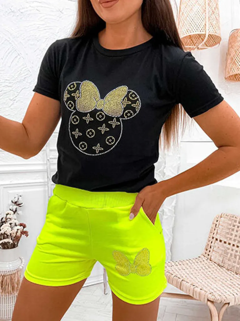 - Damski komplet wykonany z przyjemnego materiału. Model posiada ozdobny cekinowy wzór. Bluzka z krótkimi rękawami oraz krótkimi spodenki z gumą w pasie i 2 kieszeniami. Poczuj lato w tym wspaniałym komplecie!